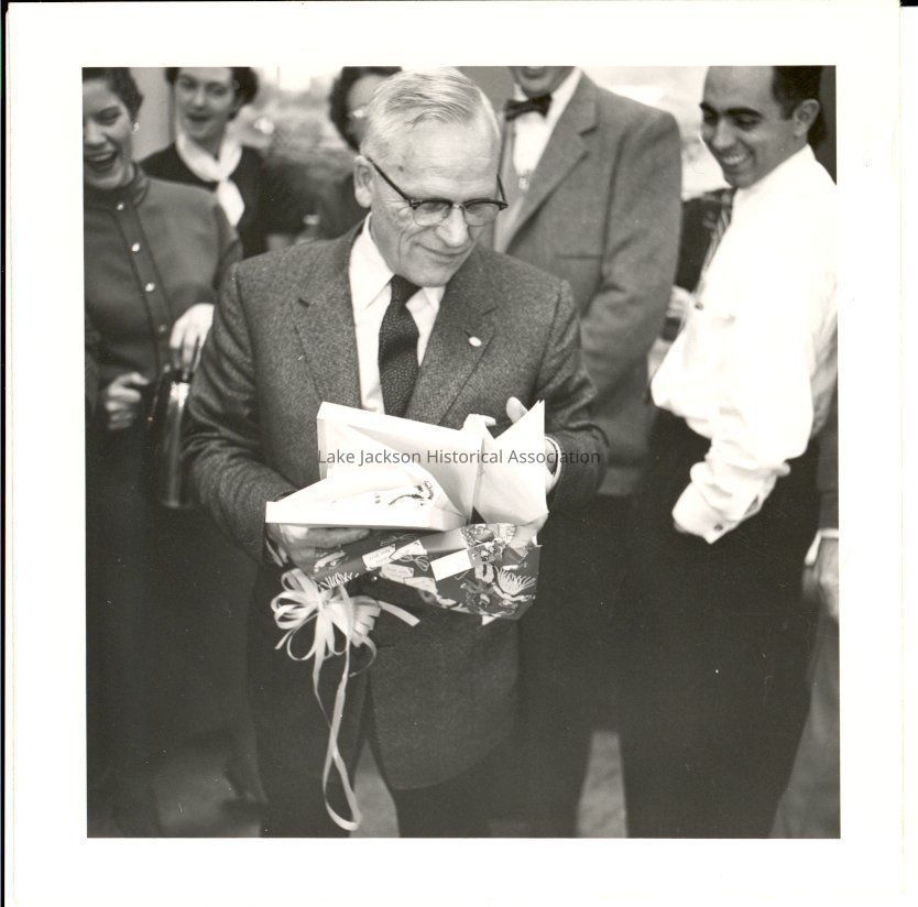 Black and white photo of Dr. Beutel opening a Christmas present.Collection