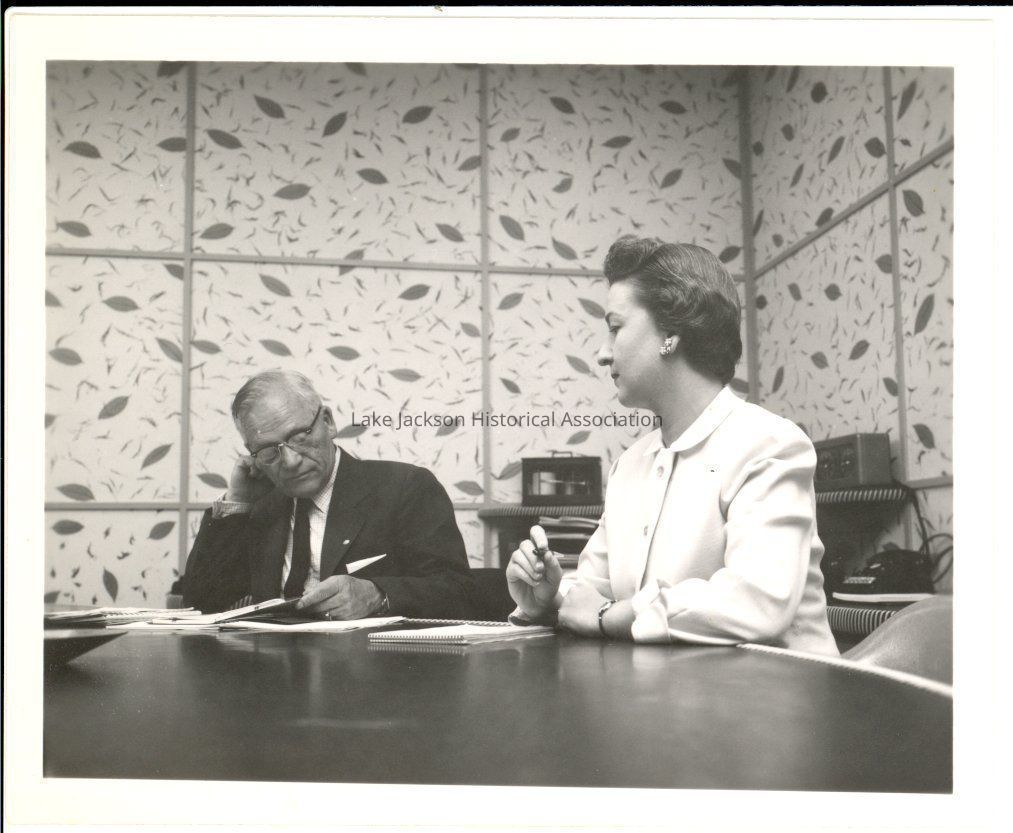 Black and white photo of Dr. Beutel and an unknown woman sitting in his office.Collection