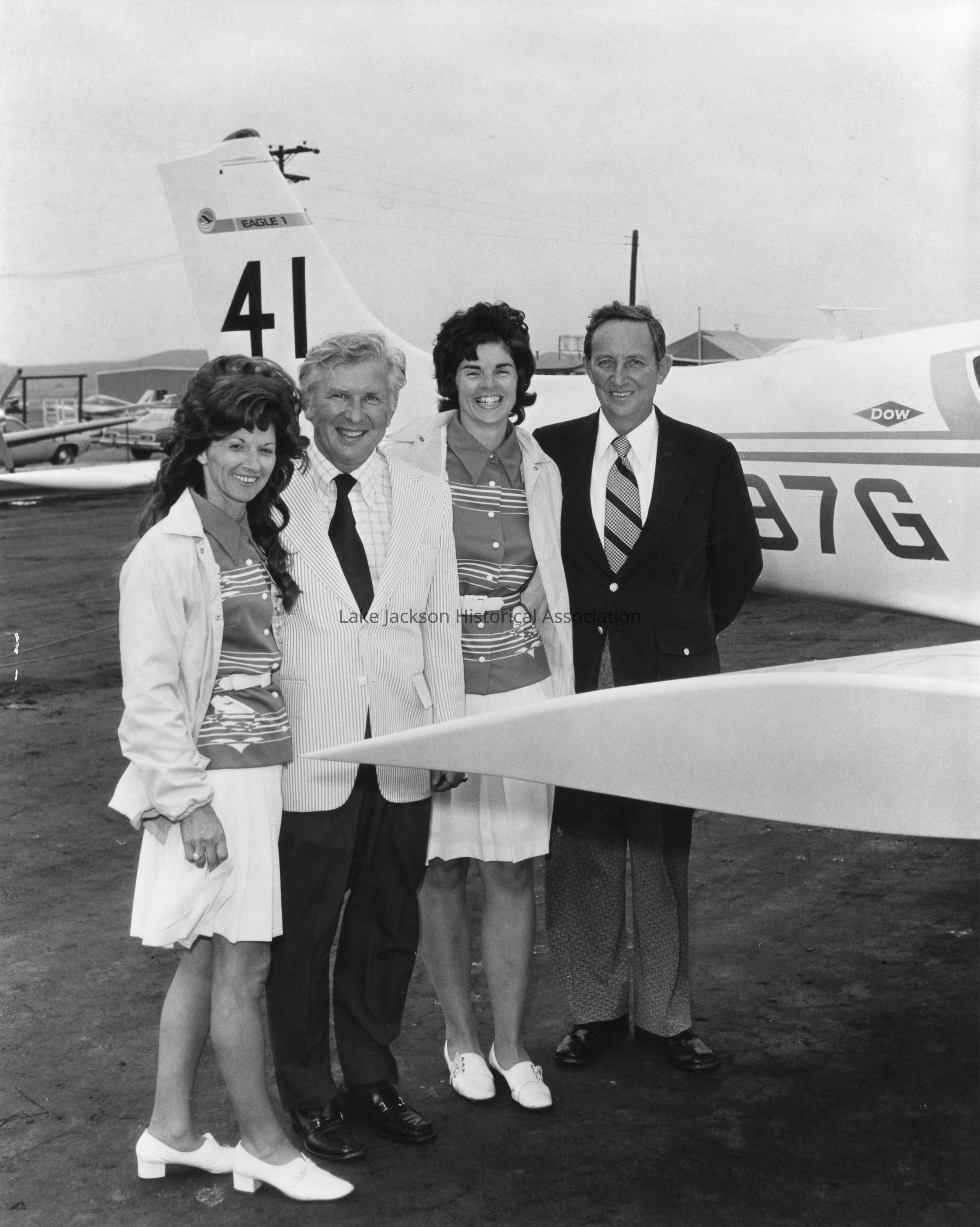 Black and white photo of Stephanie Vickery, an unknown man, Billie Joyce Wyche, and Leo Windecker standing in front of the Windecker Eagle (N4197G) that the women flew in the Powder Puff Derby.Collection