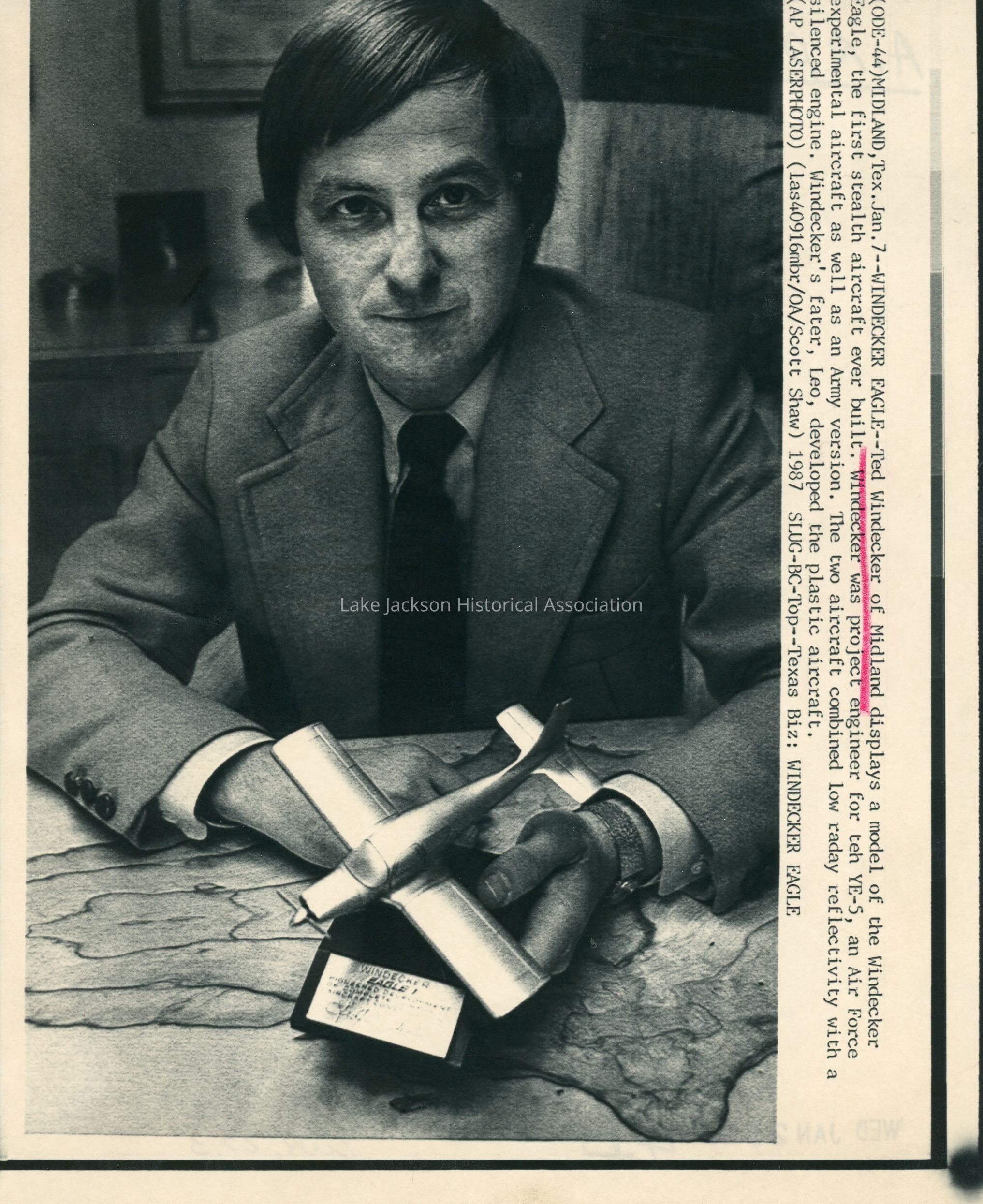 Black and white photo of Ted Windecker. The photo has the following written on the right-hand side. "Midland, Tex. Jan. 7--Windecker Eagle--Ted Windecker of Midland displays a model of the Windecker Eagle, the first stealth aircraft ever built. Windecker was project engineer for the YE-5, an Air Force experimental aircraft as well as an Army version. The two aircraft combined low radar reflectivity with a silenced engine. Windecker's father, Leo, developed the plastic aircraft."Collection