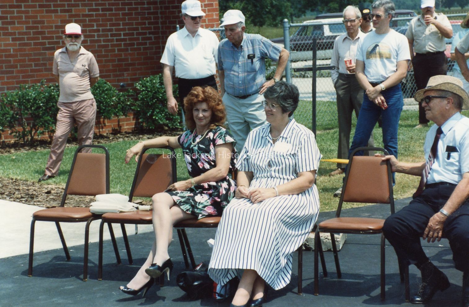 Color photo of the Powder Puff Derby Women Flyers from left to right sitting: Stephanie Vickery and Billie Joyce Wyche. Standing in the left-hand corner are Milton Wing and Ray Brubaker.Collection