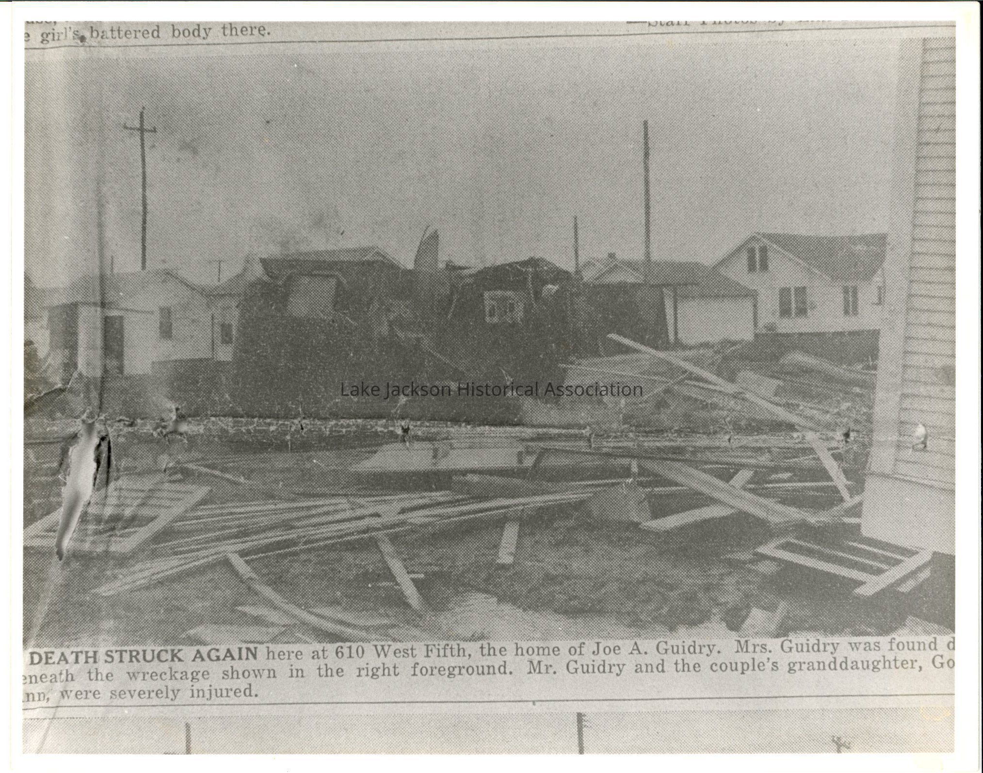 The byline says, "Death struck again here at 610 W. 5th, the home of Joe A. Guidry. Mrs. Guidry was found dead beneath the wreckage shown in the right foreground. Mr. Guidry and the couple's granddaughter, ......