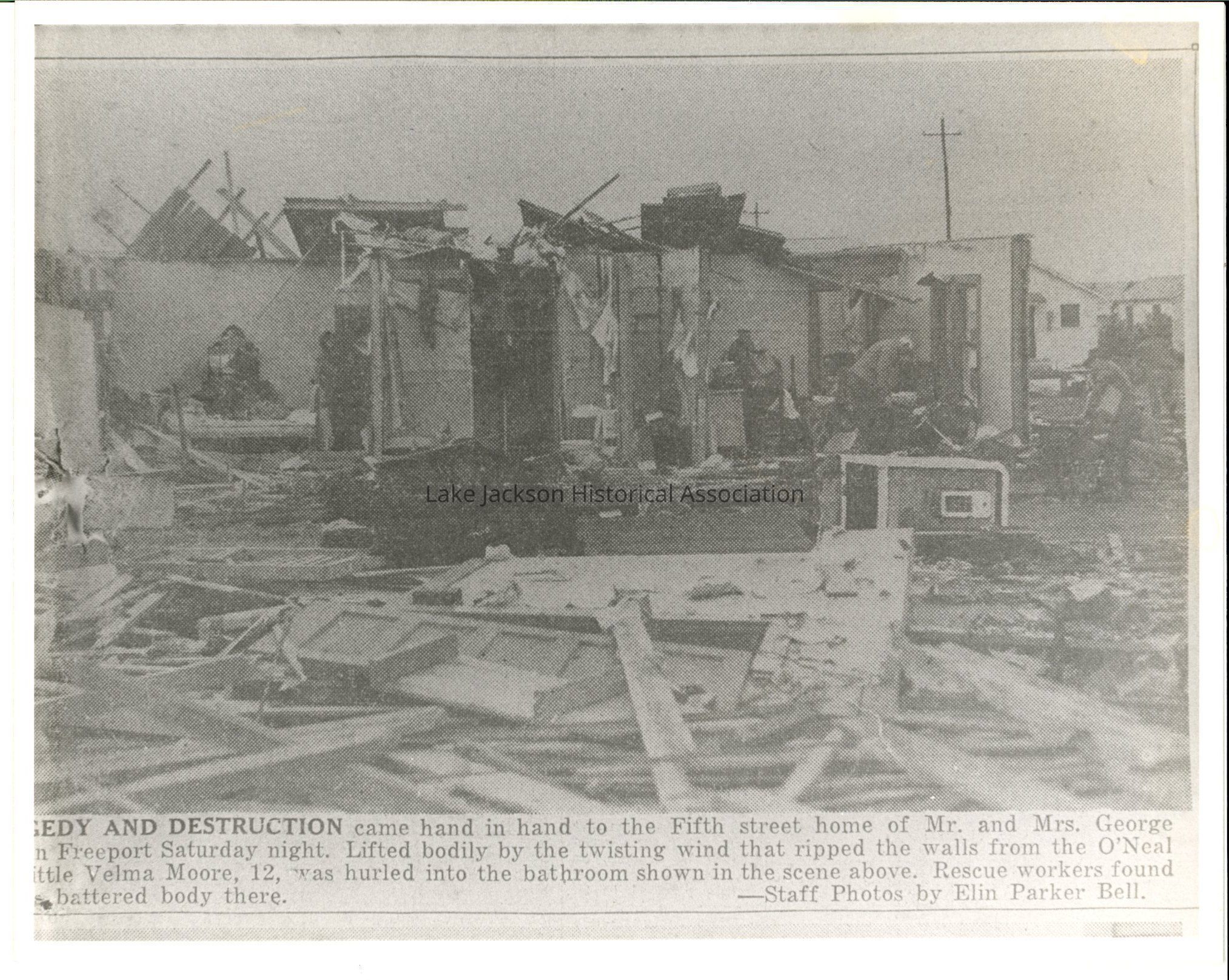 B/W Photo of 1943 Freeport Tornado damage to a home on 5th St. The byline reads "Tragedy and destruction came hand in hand to the Fifth St. home of Mr. & Mrs. George ... Freeport Saturday night. Lifted bodily by the twisting wind that ripped the walls from the O'Neal .... little Velma Moore, 12, was hurled into the bathroom shown in the scene above. Rescue workers found ......battered body there." Photos by Elin Parker BellCollection