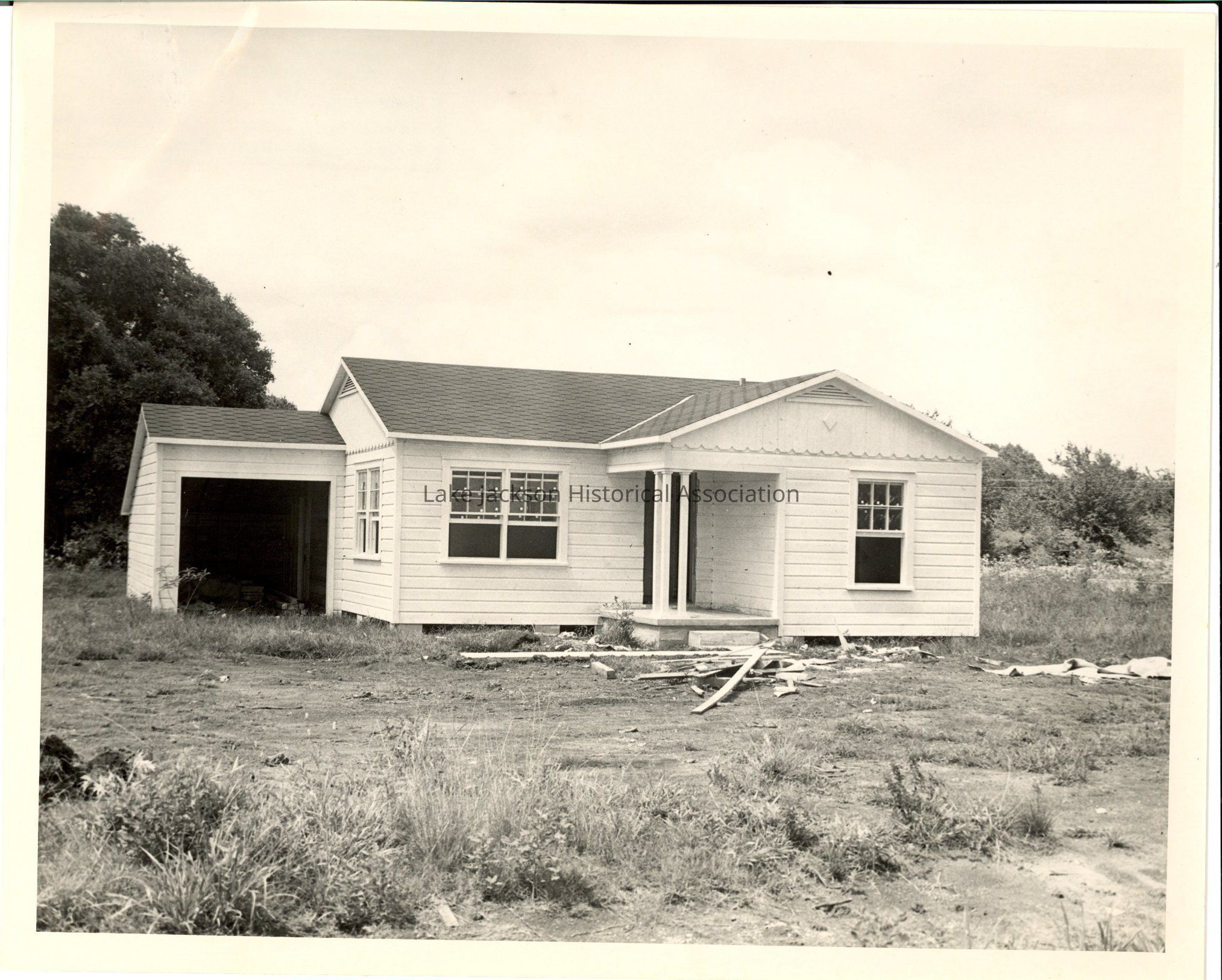 A black & white photo of a house under construction, possibly in Freeport. Appears to be grouped with the Pat Funk house location (2005.2.3)Collection