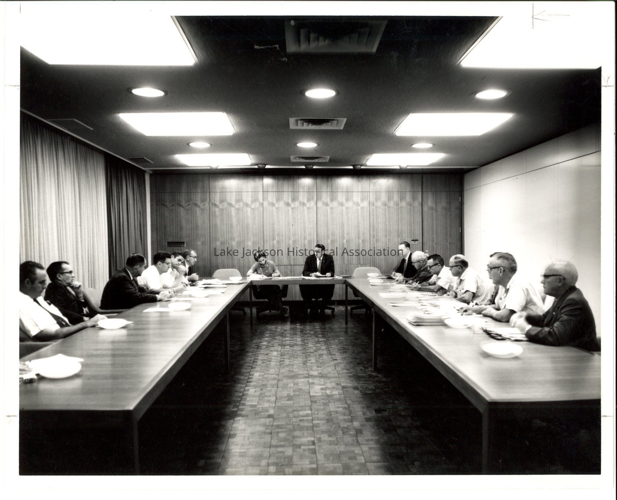 A black & white photo of people sitting around tables in a staff meeting setting, with Earle Barnes at the head of the tables.Collection