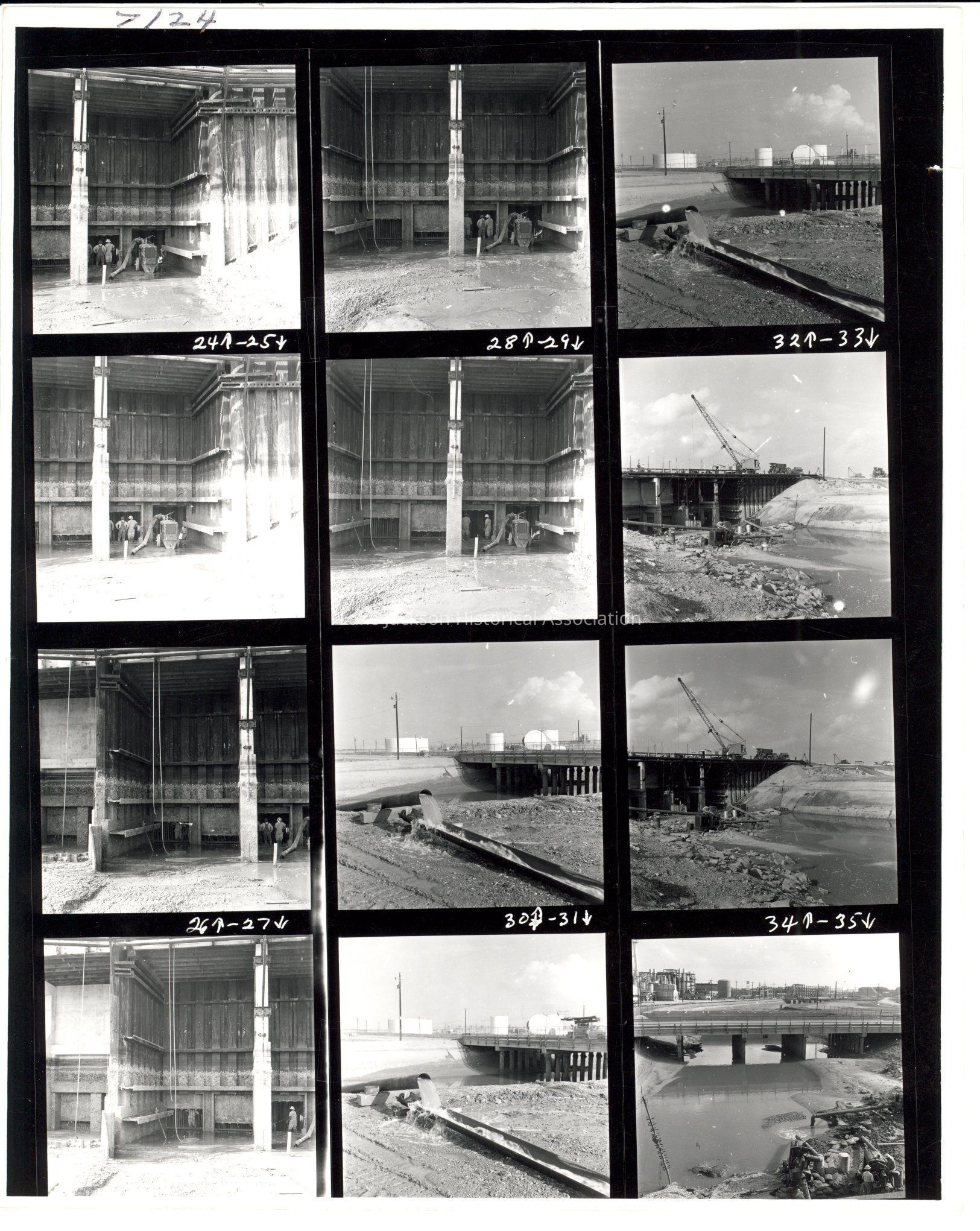 A sheet of 12 black & white proofs of pictures showing the construction of what appears to be the cleaning up after Hurricane Carla.Collection