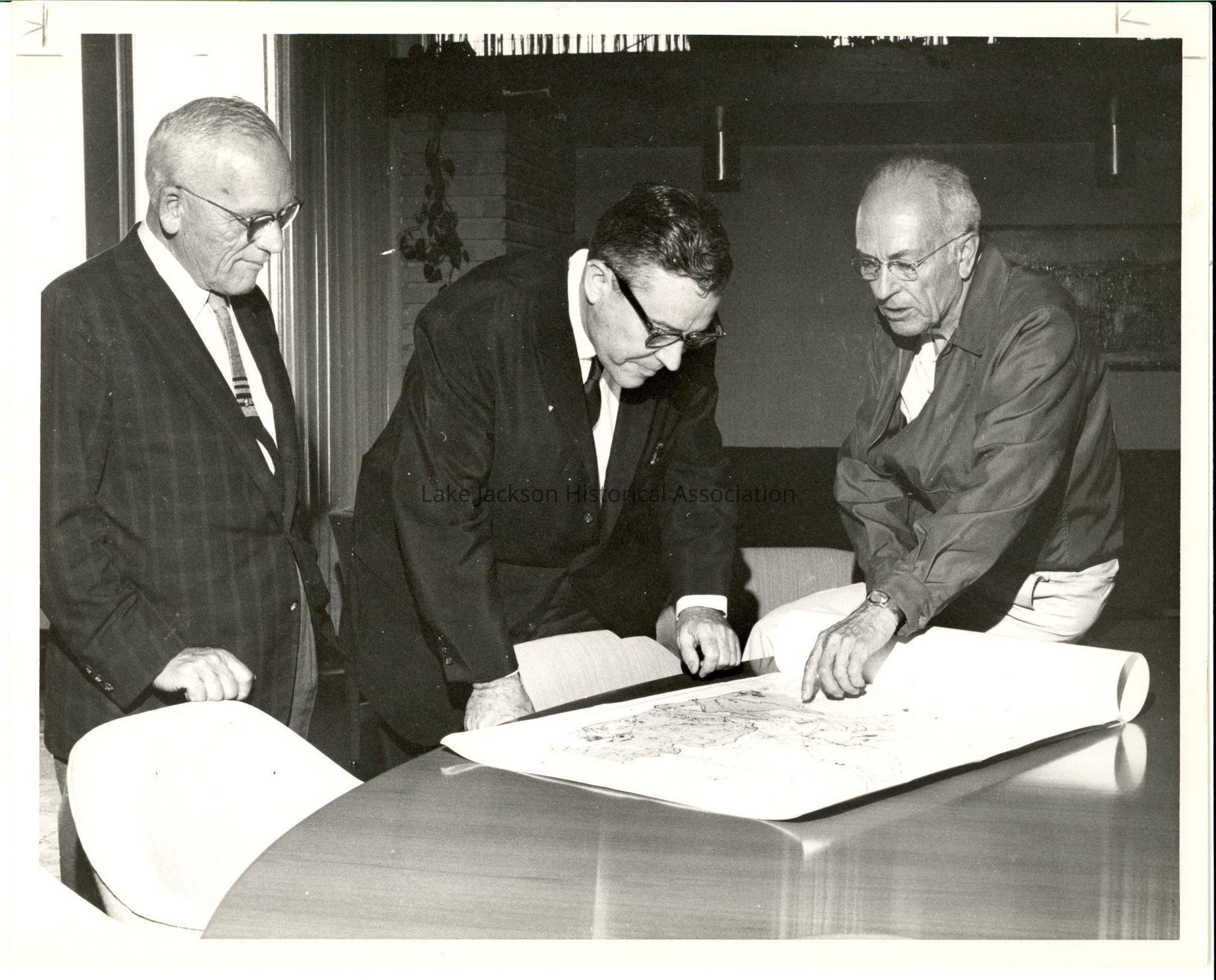A Black & White Photo of Dr. Beutel and 2 other men looking over a map. The back of the picture reads: