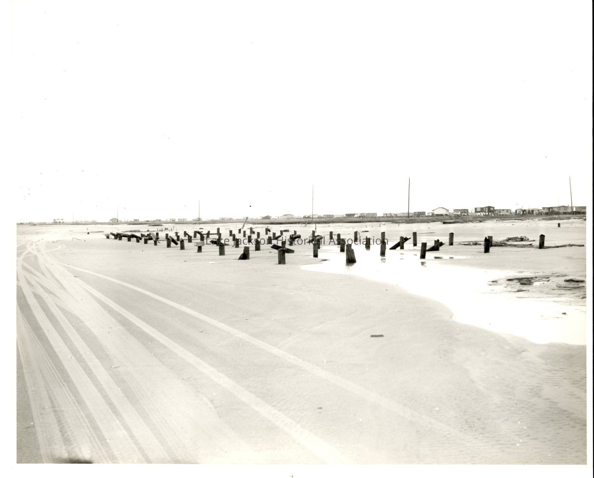 A black & white photo of Surfside Beach showing stobs in the sand where a building or a pier used to be. Possibly the aftermath of Hurricane Carla. Shows beach houses in the background.Collection