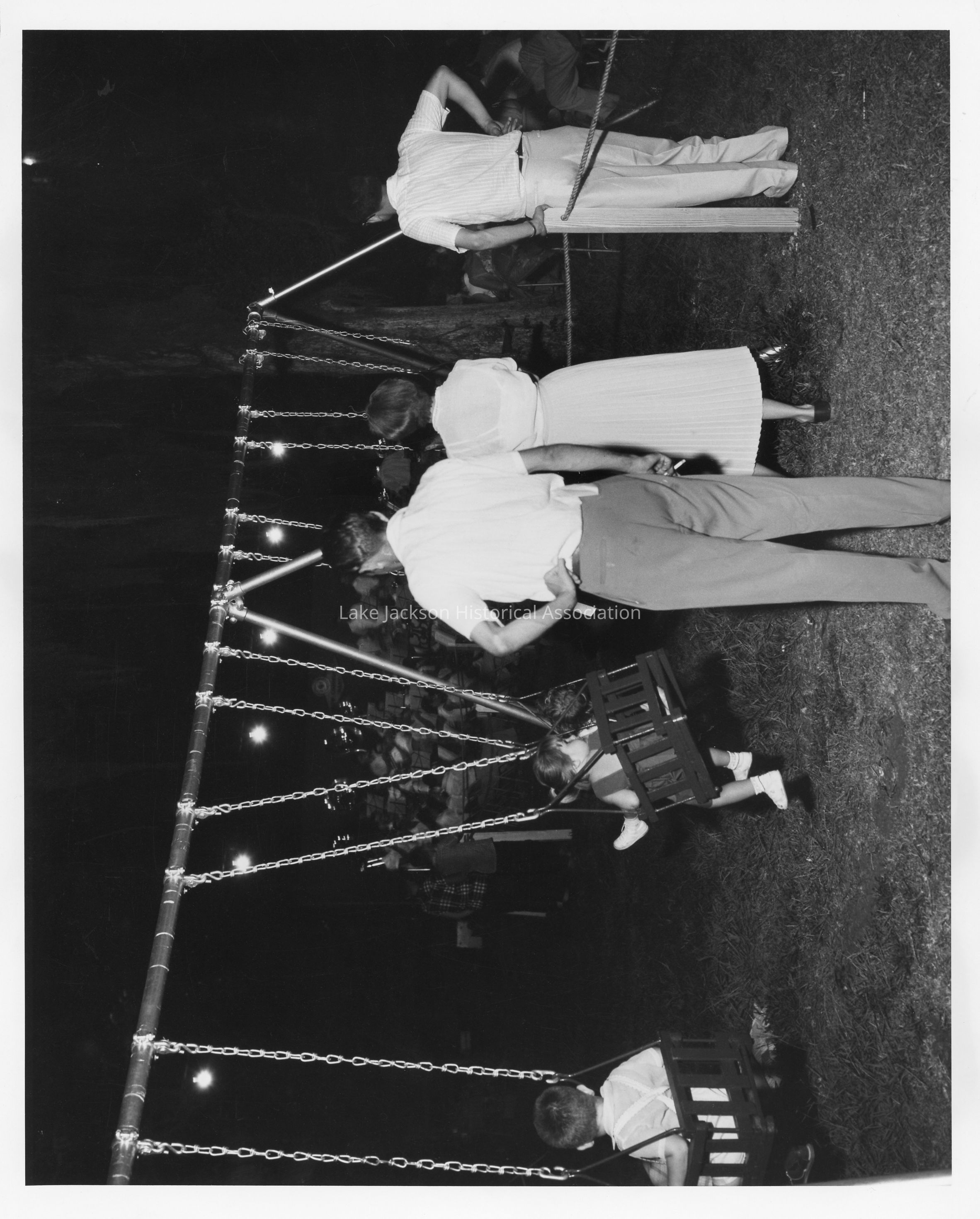 A Black & White Photo of the Dow Community Band in their concert. Shows parents swinging children as the band plays.Collection
