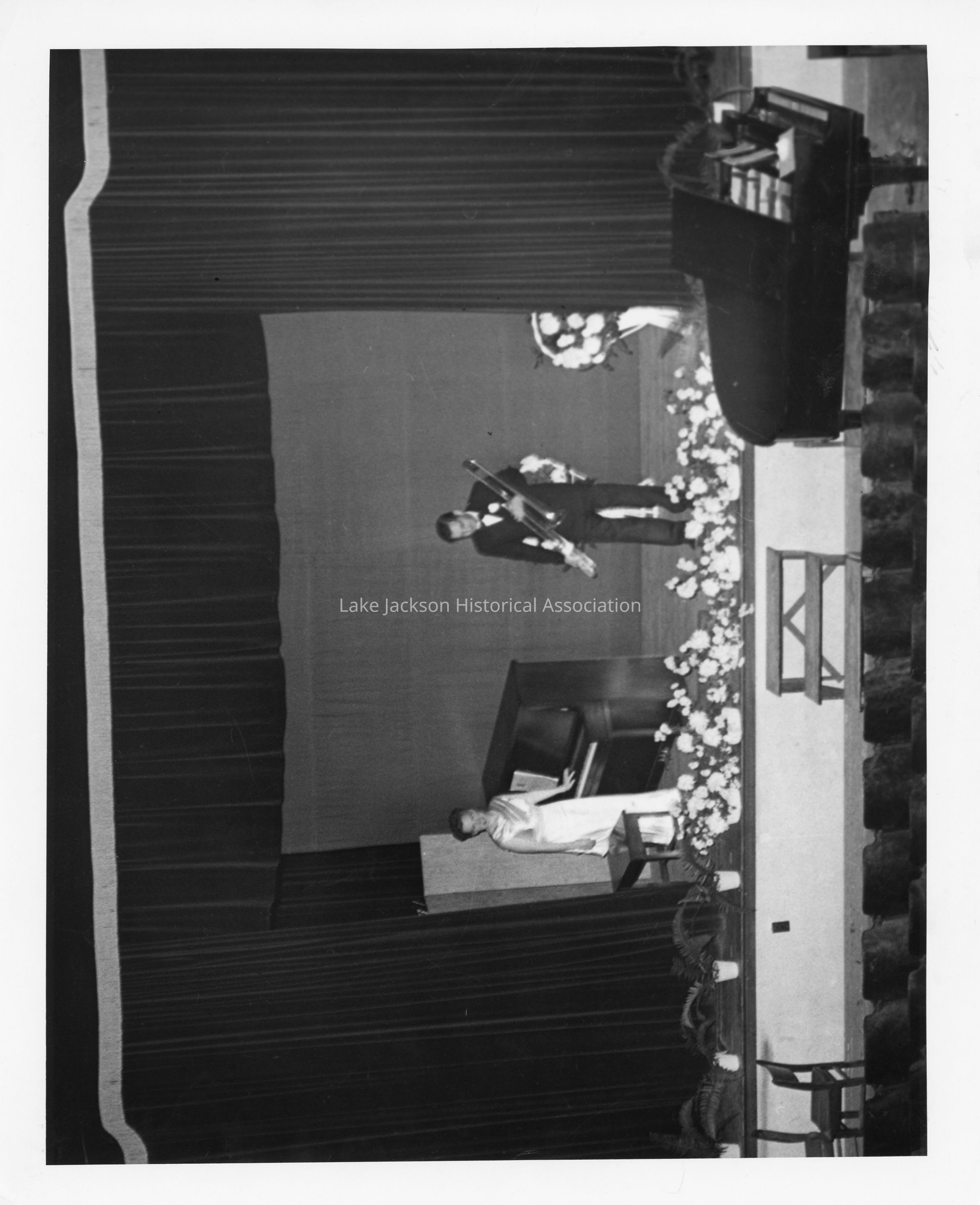 A black & white photo of a woman performing on a piano and a man playing a trombone.Collection