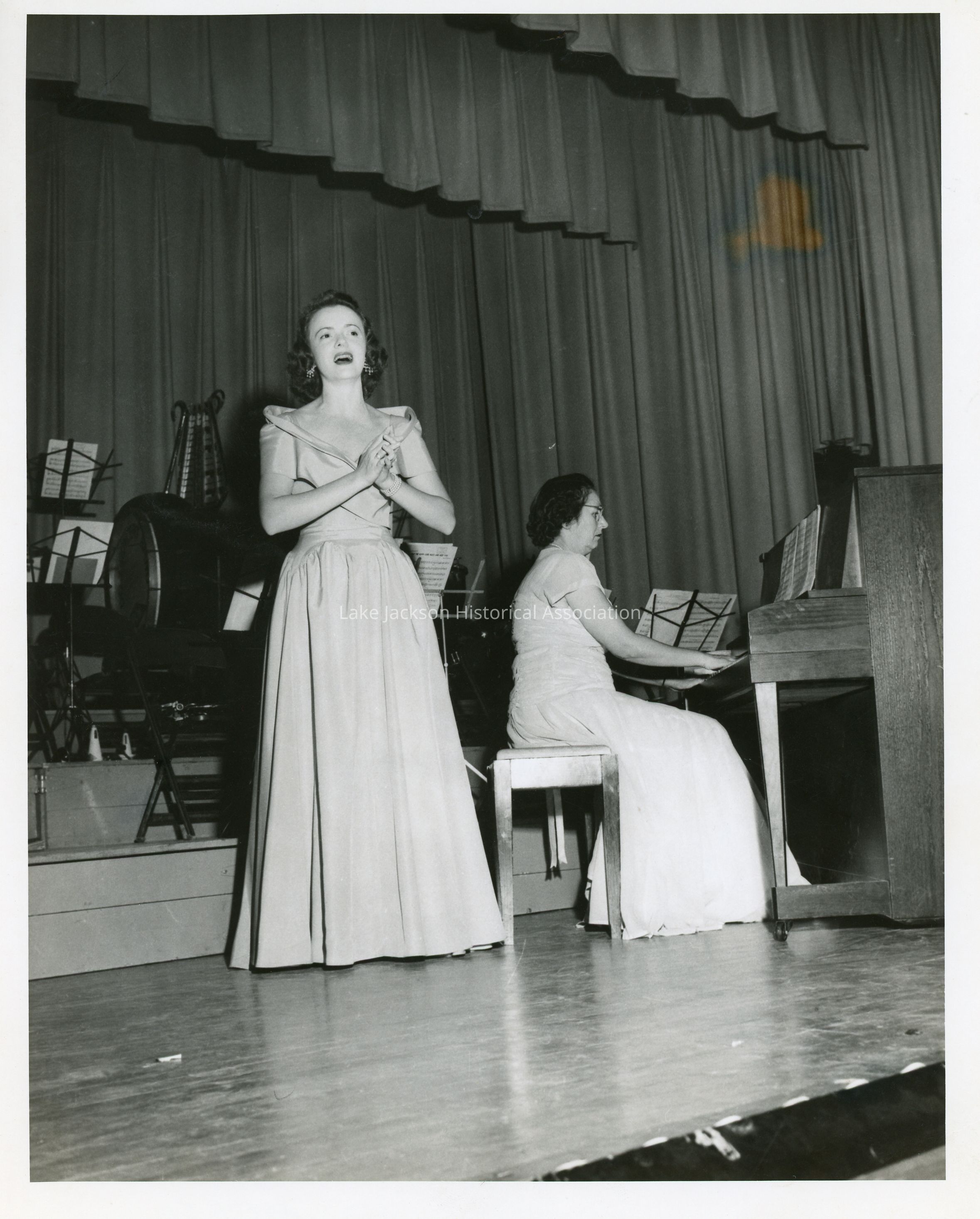 A black & white photo of 2 ladies performing on stage. One is singing, and the other is accompanying her on the piano.Collection