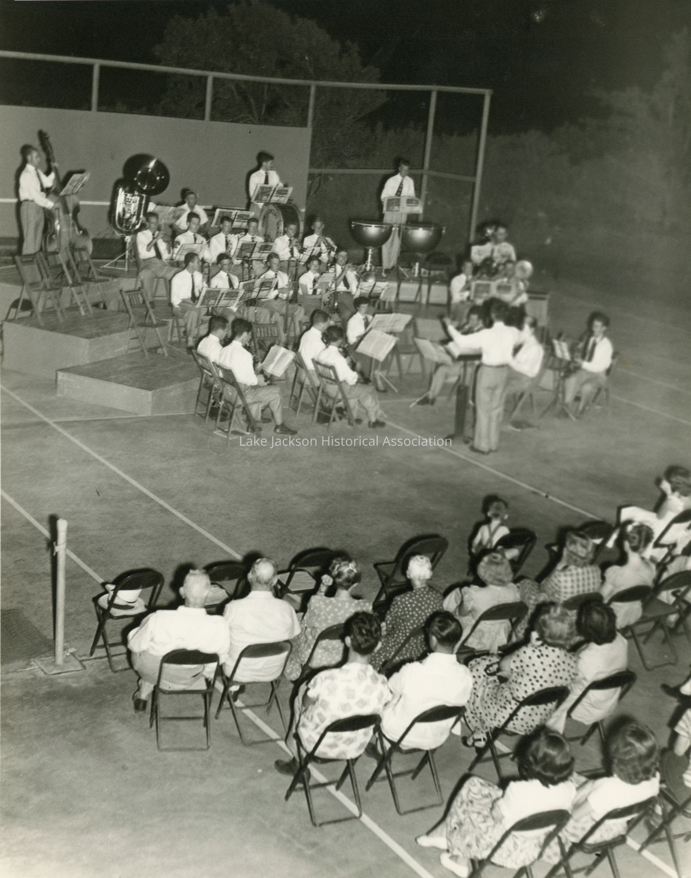 A black & white photo of the Dow Community Band in their concert.Collection
