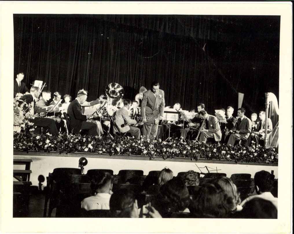 A black & white photo of what appears to be the Dow Community Band performing.Collection