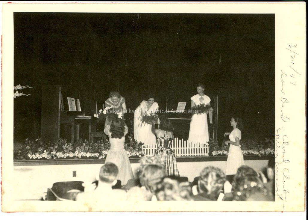 A black & white photo of ladies on stage. The caption reads: "Dow Band Choral Club Spring Concert".Collection