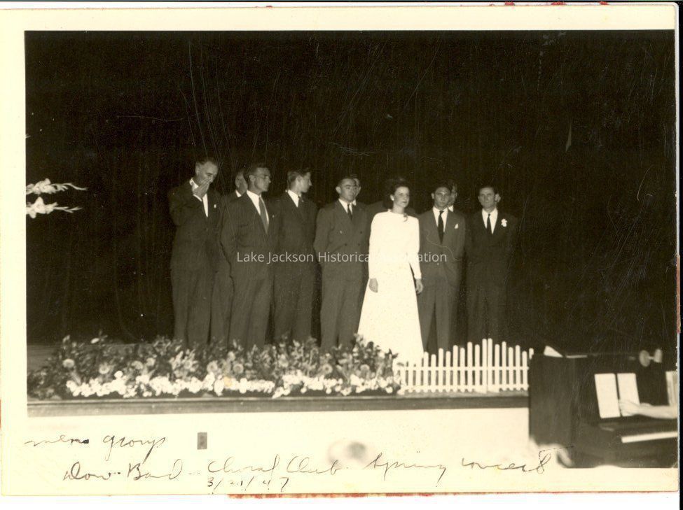 A black & white photo of men and 1 woman on stage. The caption reads: "Mens group; Dow Band Choral Club Spring Concert; 3/21/47".Collection