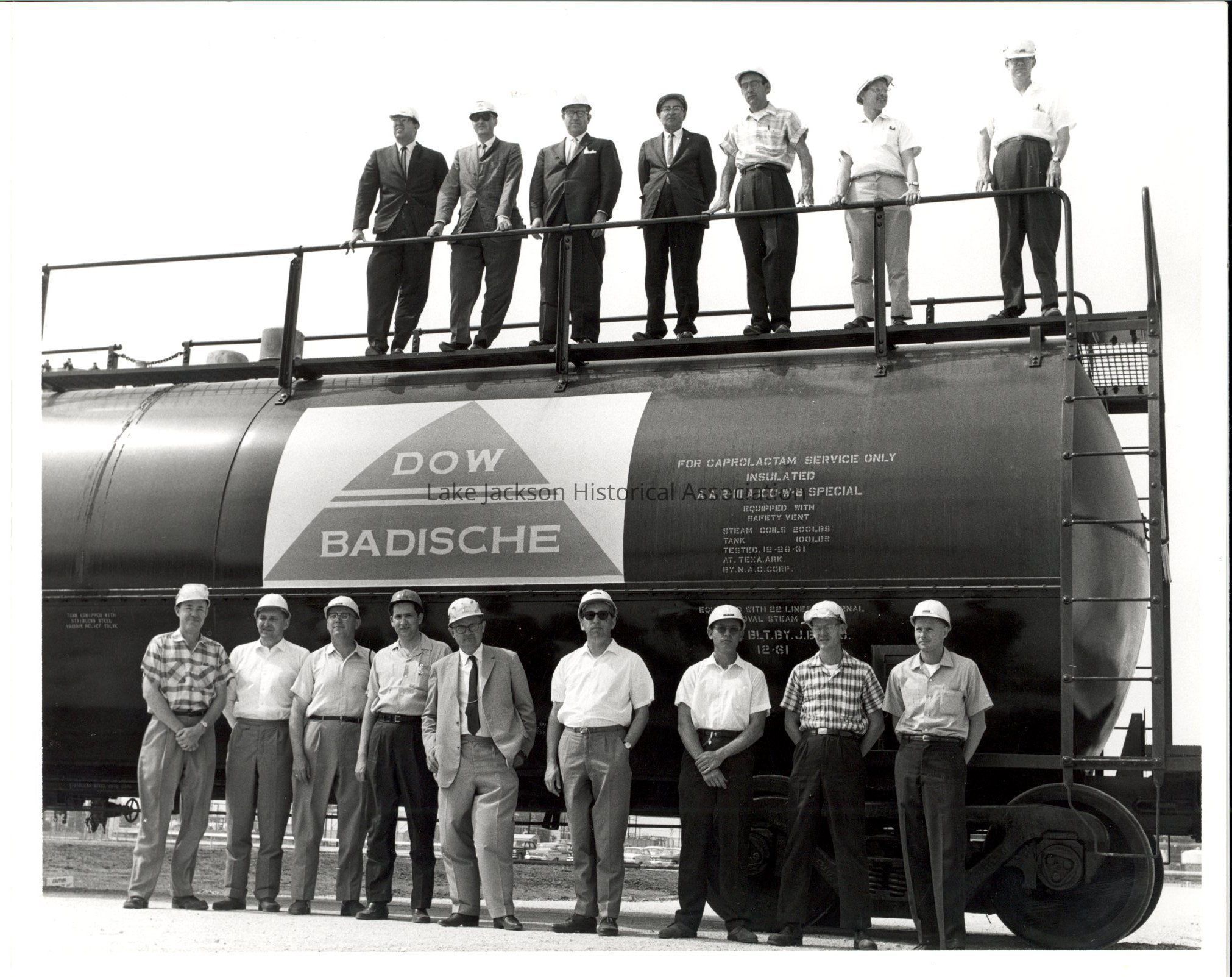 A black & white photo of the first shipment of Caprolactam. Men are standing in front of and on top of a railroad tank car.Collection