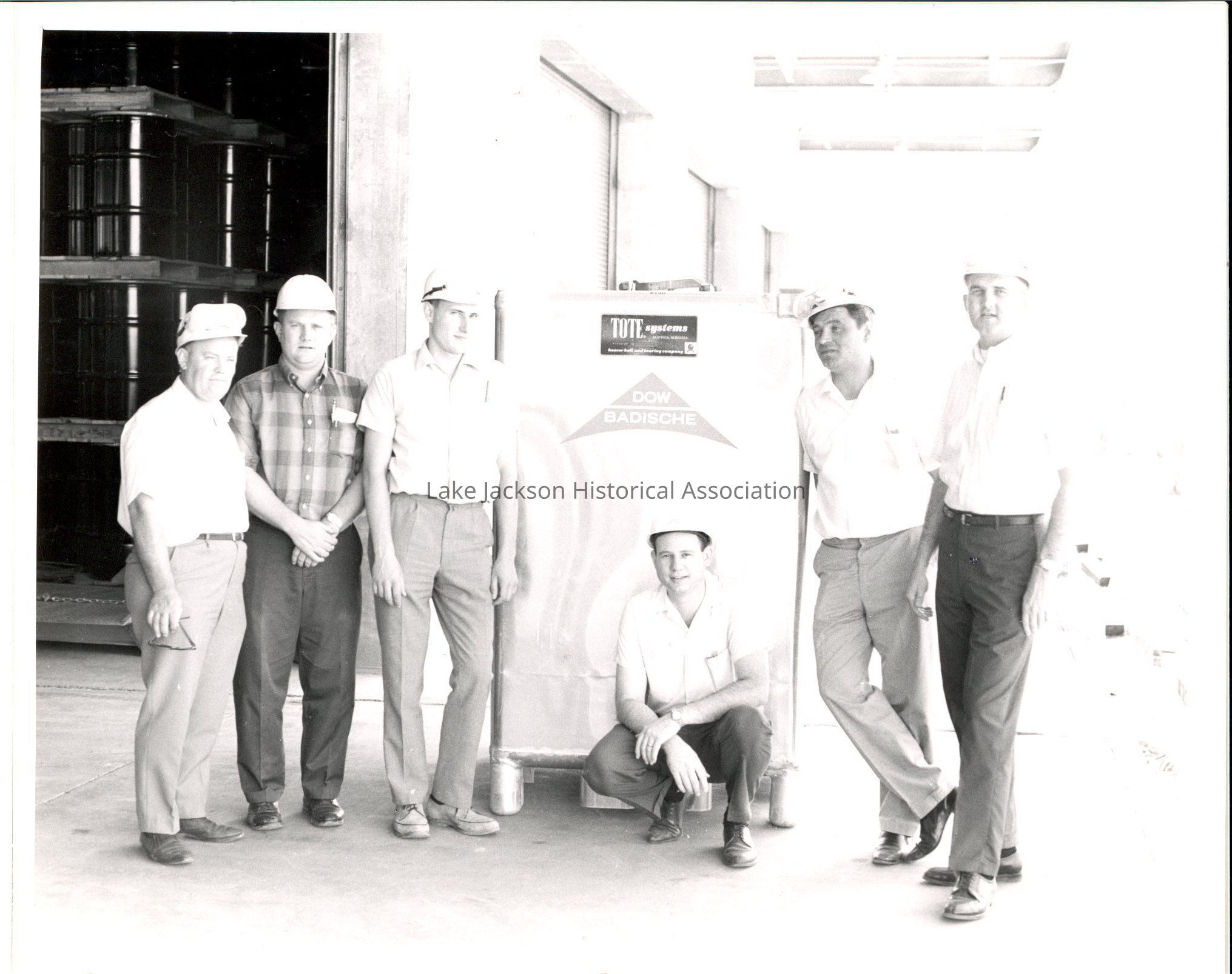 A black & white photo of the first shipment of Polycaprolactam at Dow Badische Company. 6 men are standing next to the product.Collection