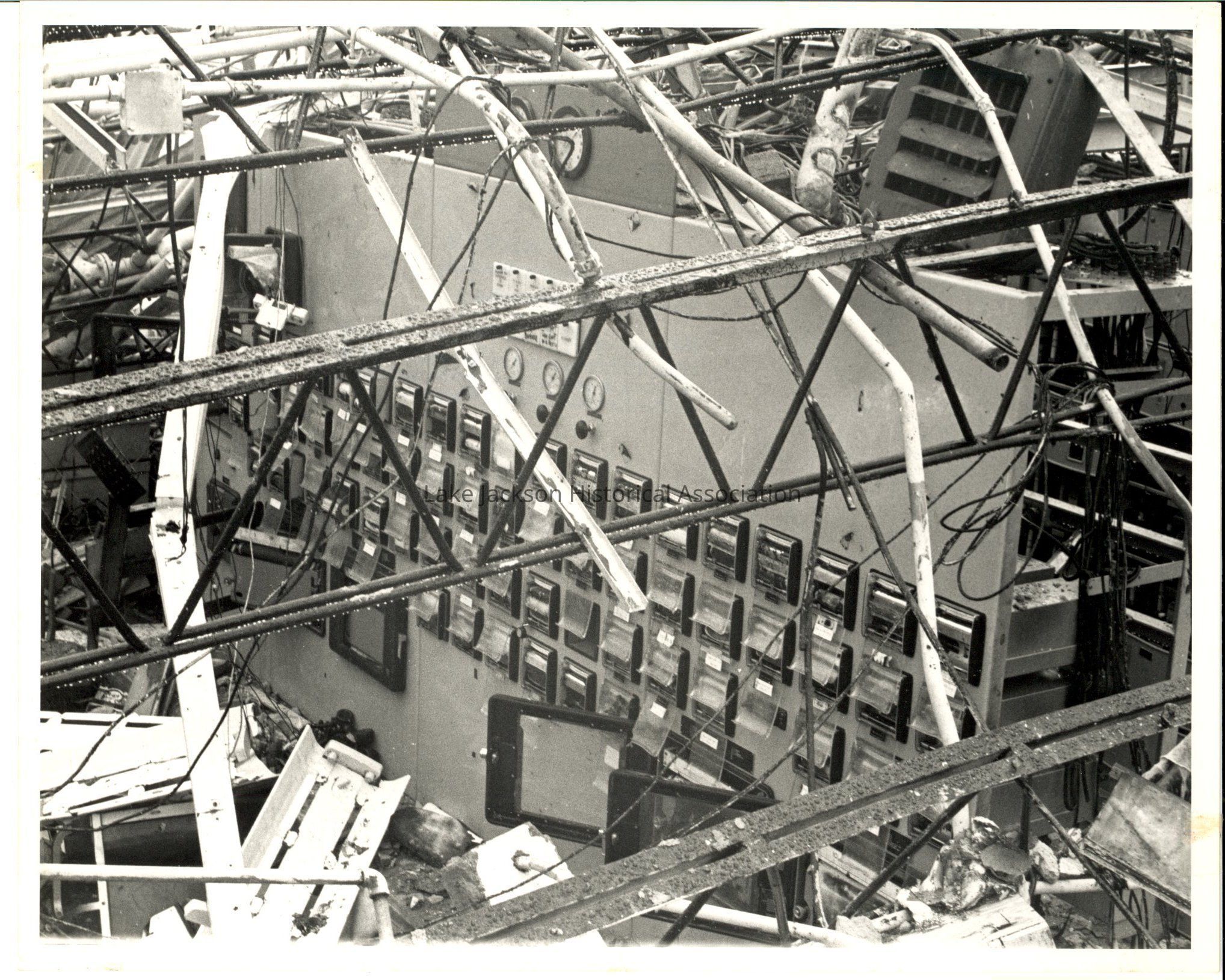 A black & white photo of the results of the 1961 explosion in the Oxidation Plant.Collection