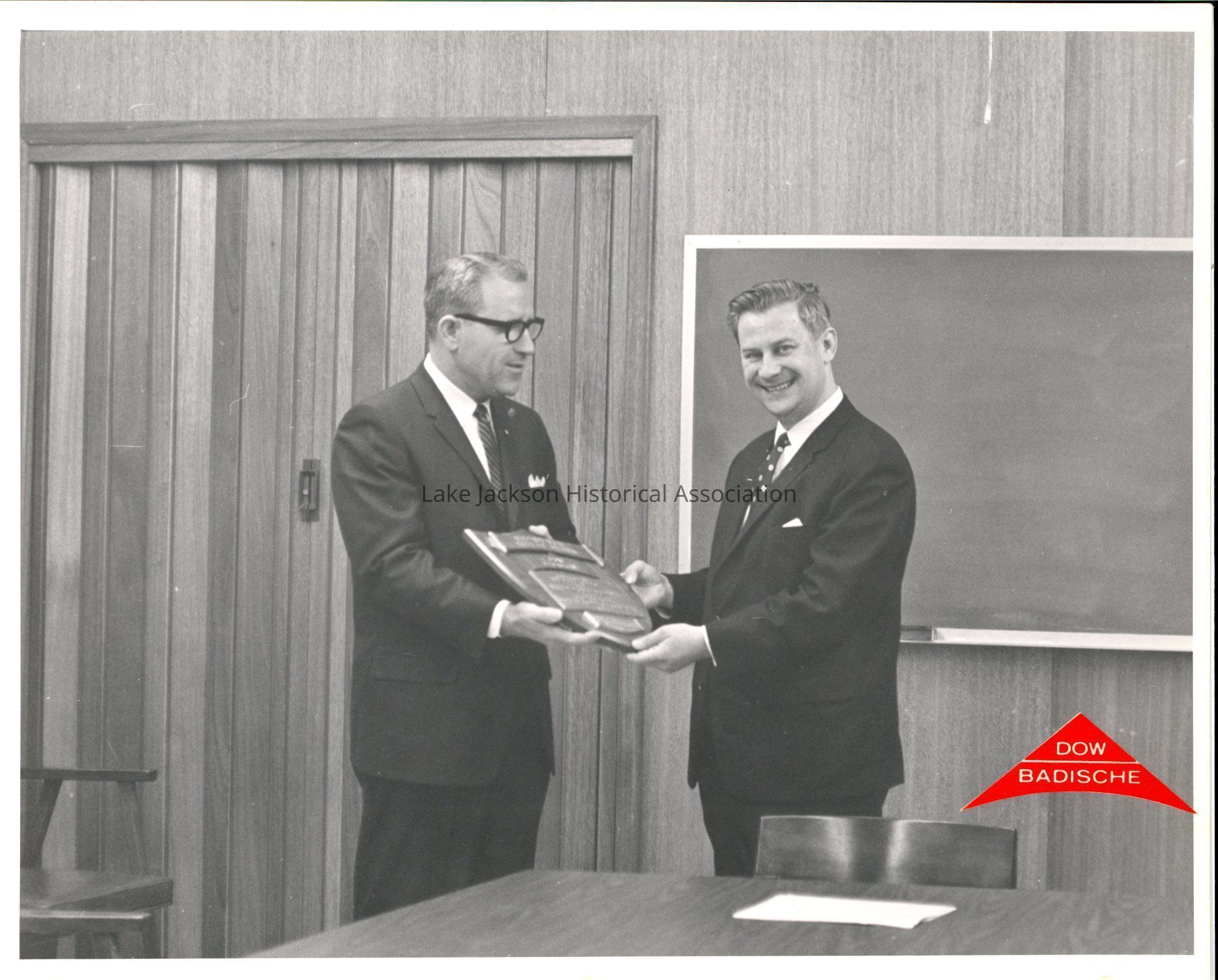 A black & white photo of a man presenting a plaque to another man. The back of the photo reads: "Presidents Safety Award for 1966"Collection