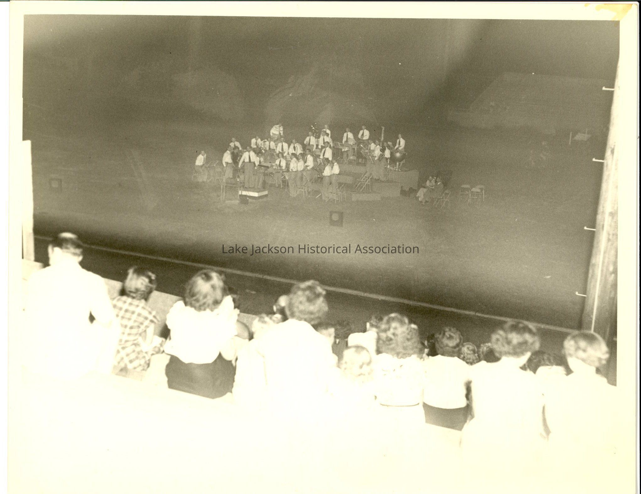 A black & white photo of people sitting in stands watching a band performance at night. Appears to be at Hopper Stadium in Freeport.Collection