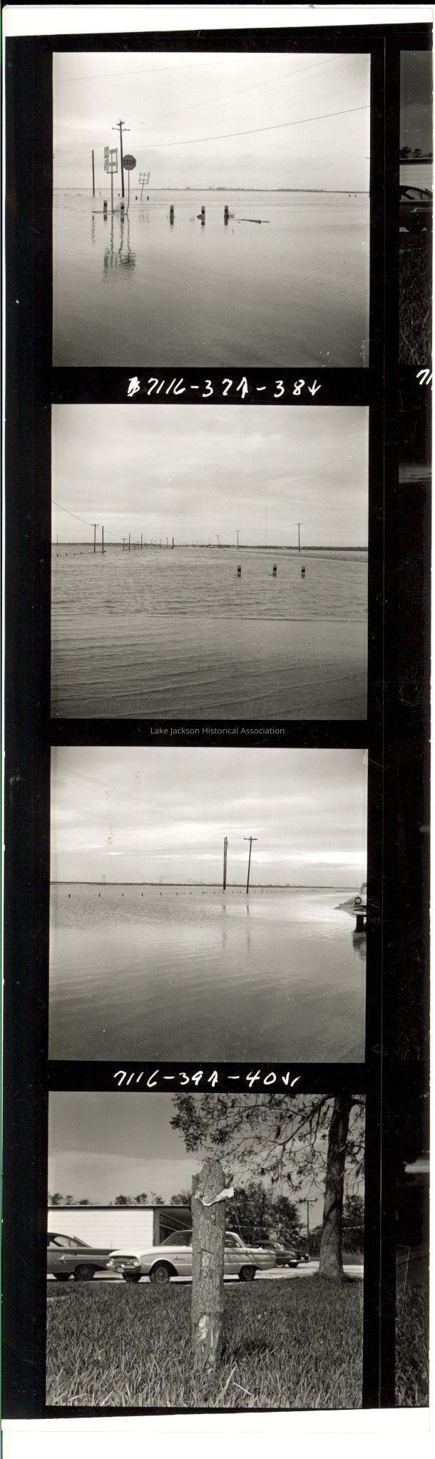 A strip of 4 black and white photo proofs. Three are pictures of what appears to be flooding after Hurricane Carla and one is a picture of a tree stump with something imbedded in it.Collection