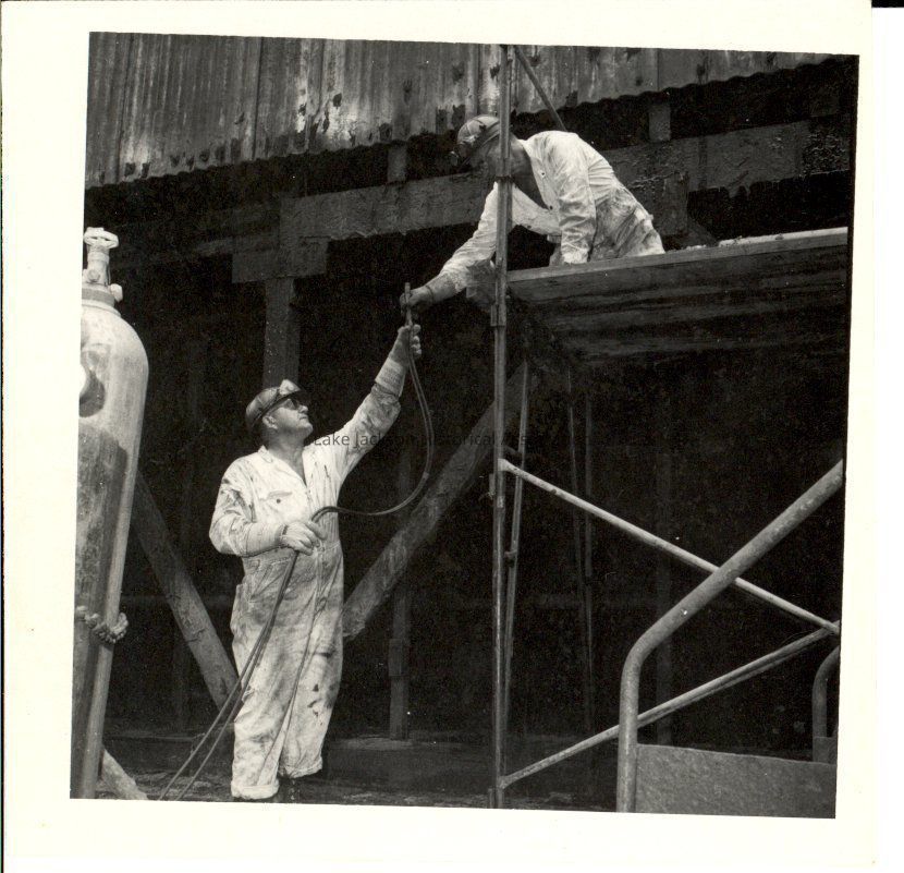 A small black and white picture of two men cleaning up after Hurricane Carla. The back of the picture reads: "F. A. Sebestan on ground; Sidney Means on Scaff.; 605 Bldg".Collection