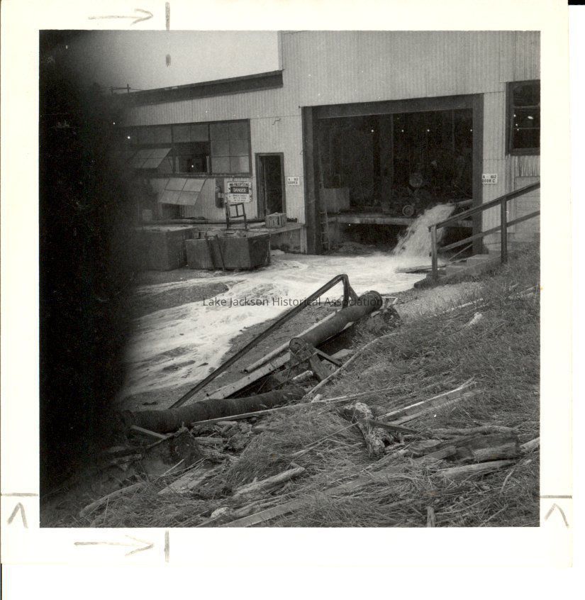 A small black and white picture of some destruction after Hurricane Carla. Back of photo reads: "Water being pumped from Caustic Bldg.".Collection