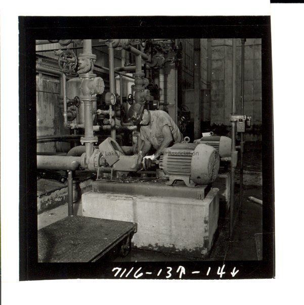A small black and white proof of a picture of a man cleaning a motor after Hurricane Carla.Collection