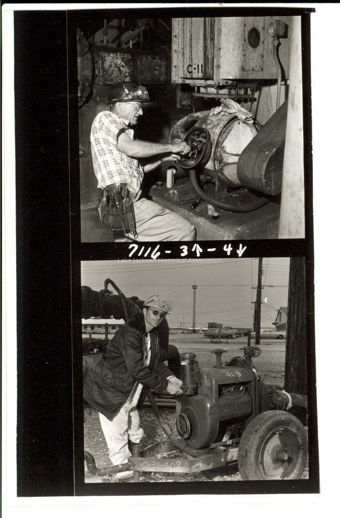Two small black and white proofs of pictures of men cleaning motors after Hurricane Carla.Collection