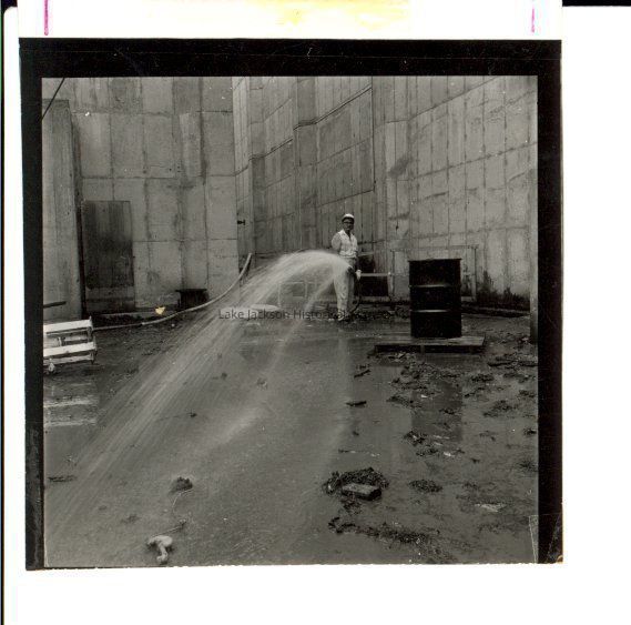 A small black and white proof of a picture of a man cleaning up after Hurricane Carla.Collection