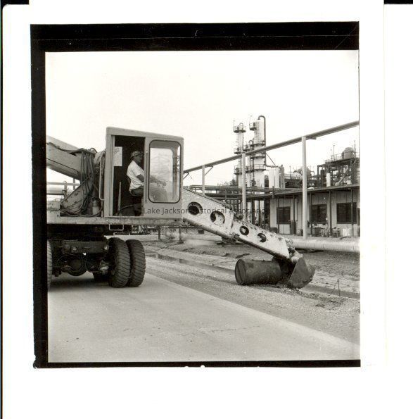 A small black and white proof of a picture of a back hoe cleaning up after Hurricane Carla. The back of the proof reads: "Removing drums from ditches".Collection