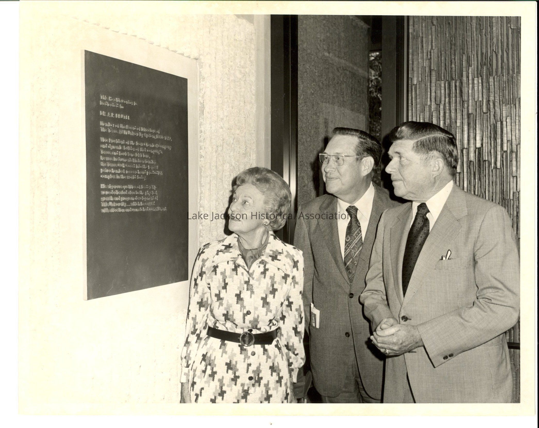 A black & white photo of a woman and two men looking at a plaque at the dedication of the A. P. Beutel Building.Collection