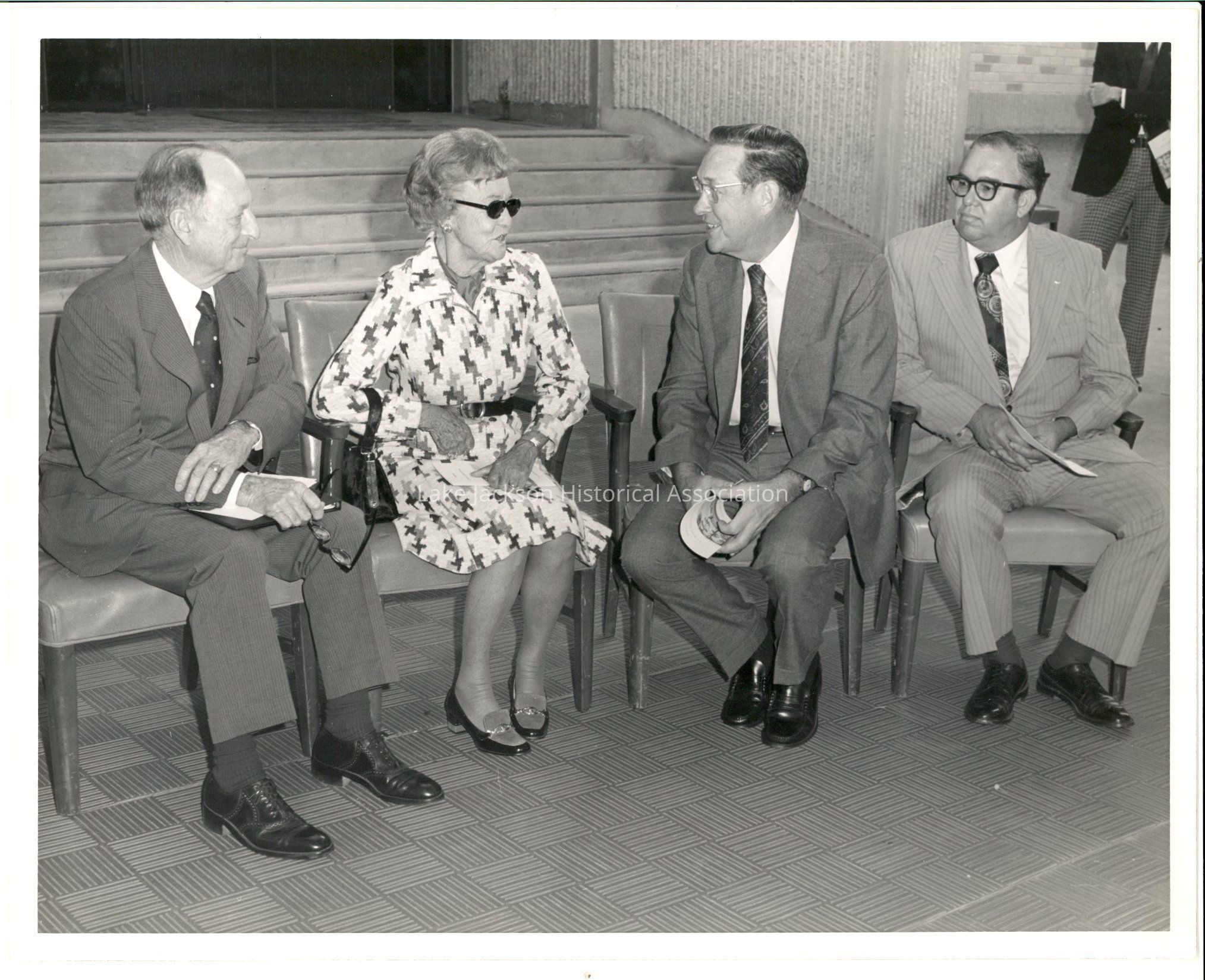 A black & white photo of a woman and some men sitting in front of the A. P. Beutel Building at its dedication.Collection