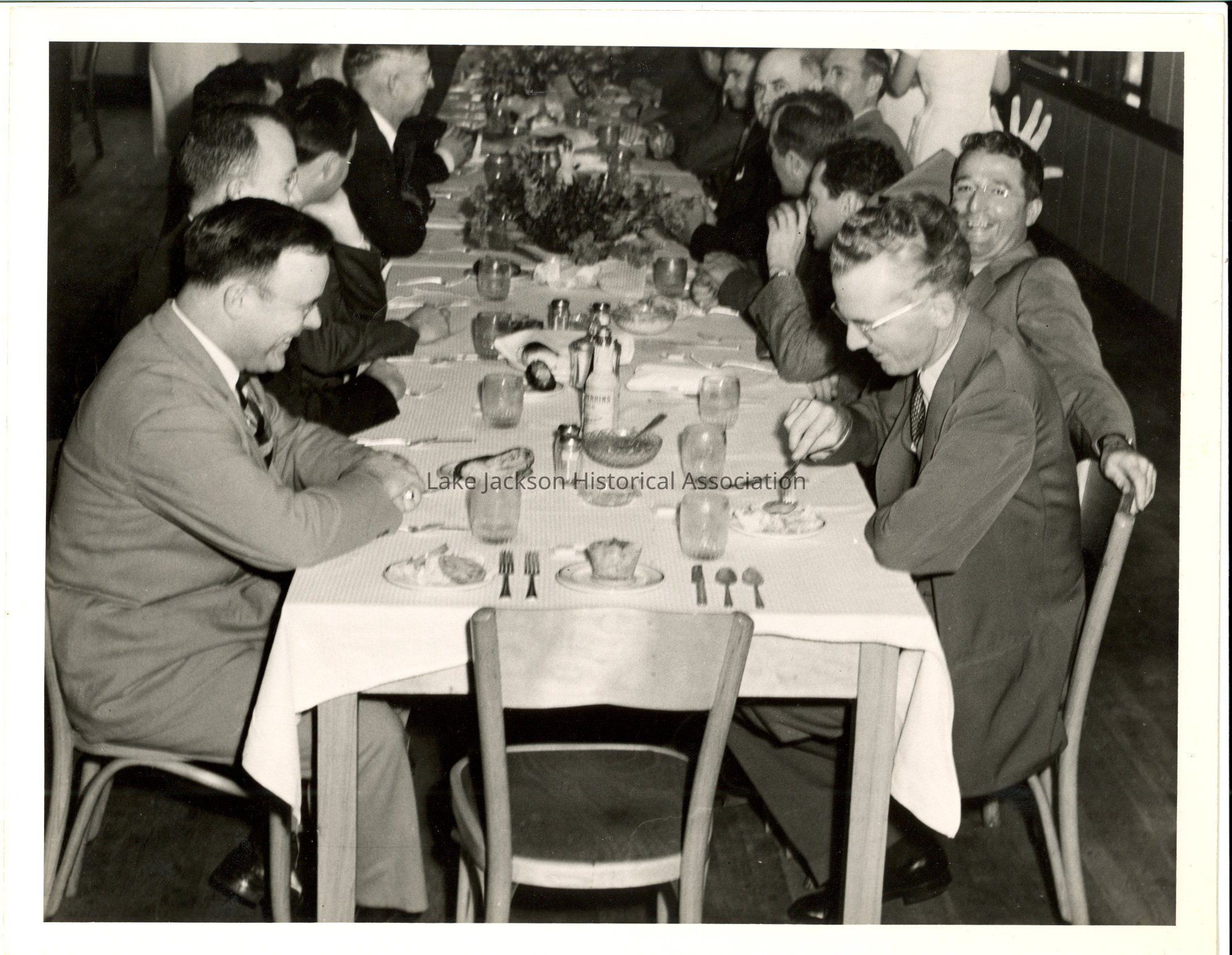 A black & white photo some men sitting at a table in a banquet setting. Appears to be Bill Colgrove sitting at table. Possibly Alden Dow and Capt. Brown also at the table.Collection