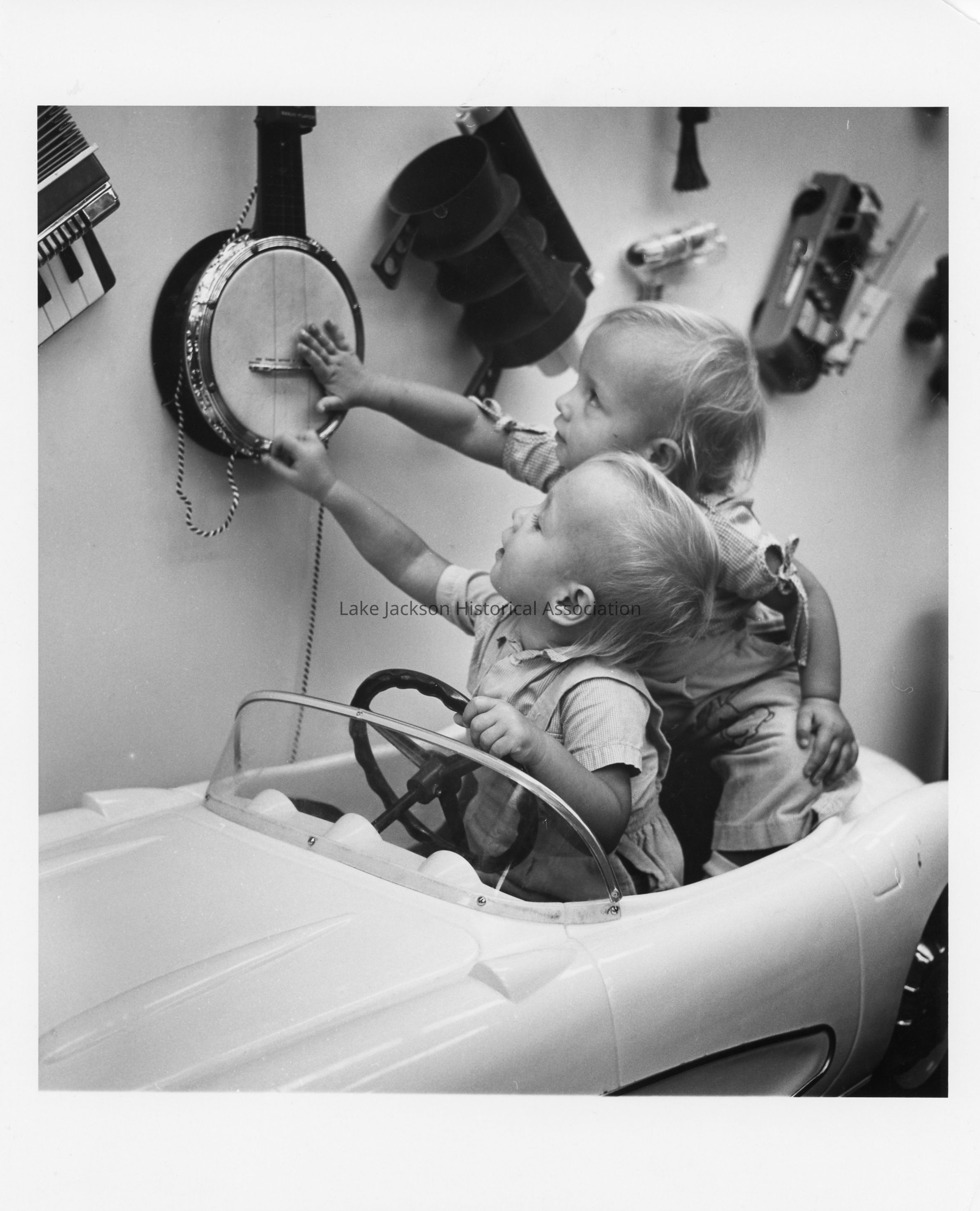 A black & white photo of two small children playing at a Dow Chemical Exhibit at the Brazoria County Fair in 1956. The children are in a small car and are touching musical instruments and other items in a display of Dow's products.Collection