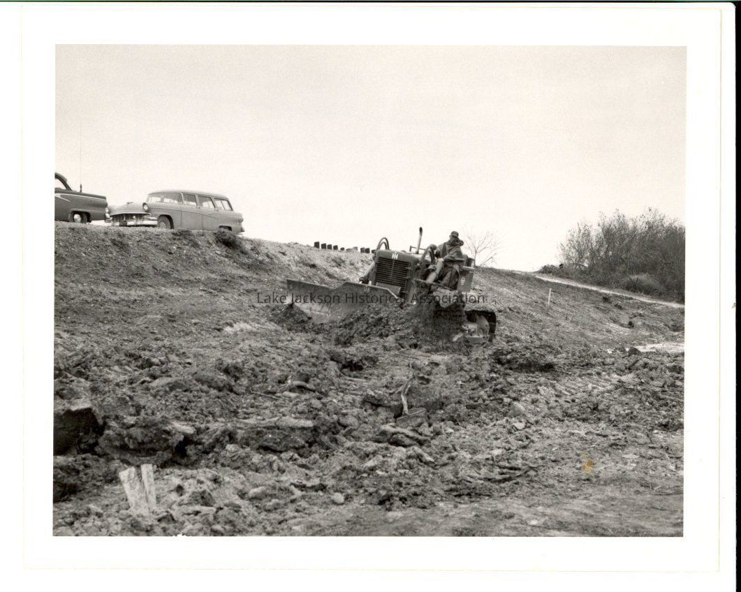 A black & white photo of a Dow Chemical employee using a machine to scrape or dig a ditch on January 7, 1957.Collection
