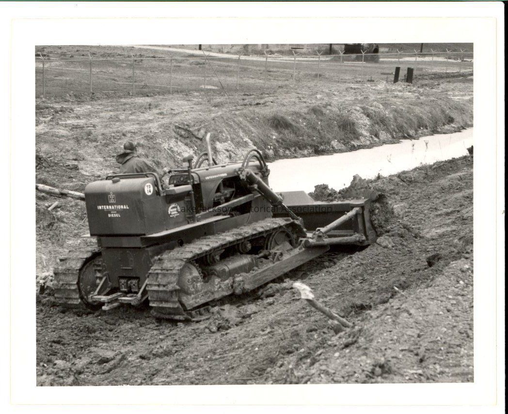 A black & white photo of a Dow Chemical employee using a machine to scrape or dig a ditch on January 7, 1957.Collection