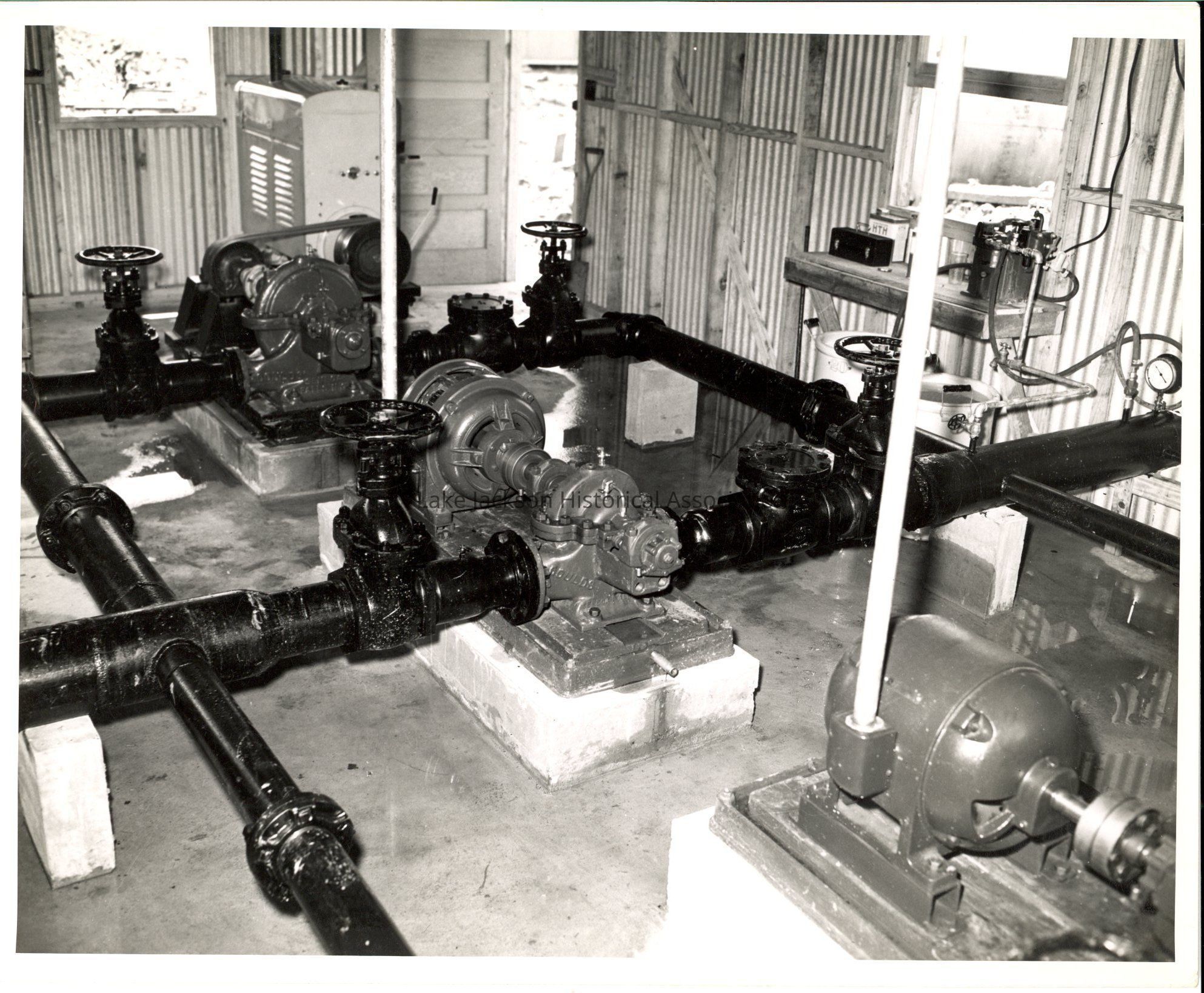 A black & white photo of the Camp Chemical water supply room and equipment.Collection