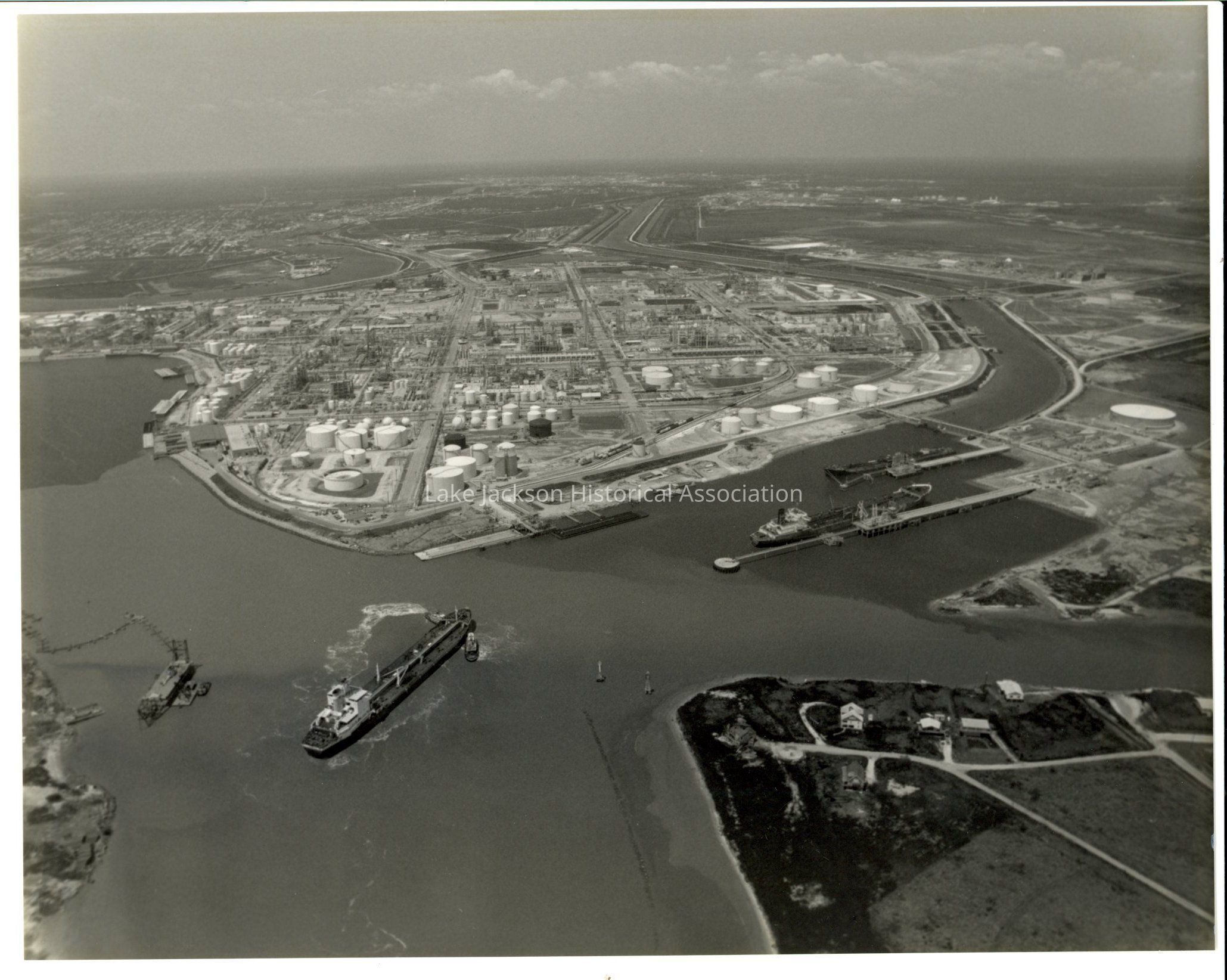 A black & white aerial photo looking from the Gulf of Mexico toward Plant A with Freeport in the left corner and Lake Jackson in the center background.Collection