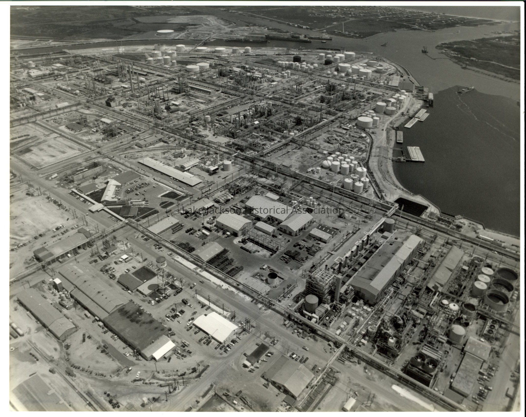 A black & white aerial photo of Plant A, looking out toward the Gulf of Mexico with the Brazos River on the right emptying into the Gulf.Collection