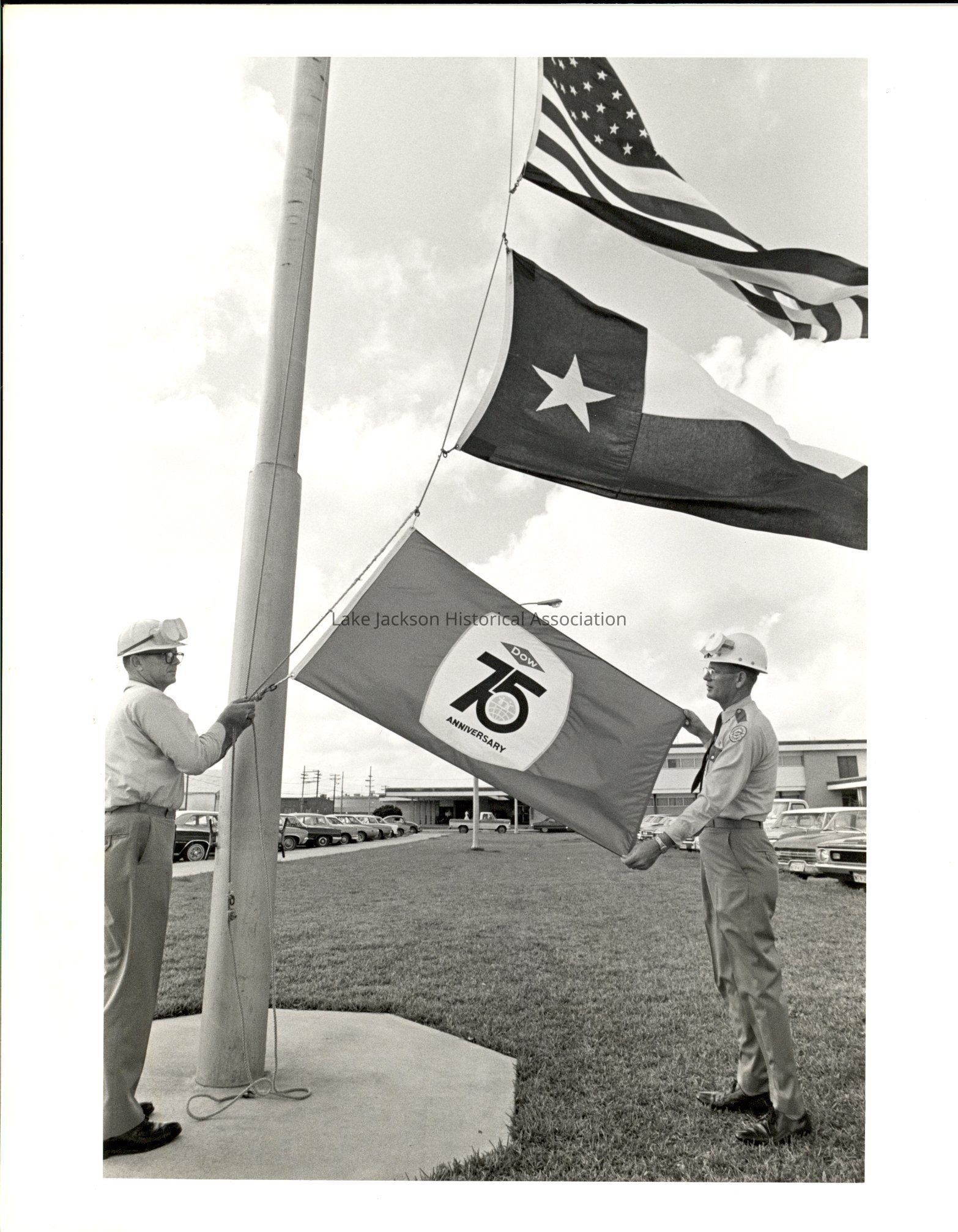 A black & white photo of the Dow Chemical 75th Anniversary flag-raising.Collection