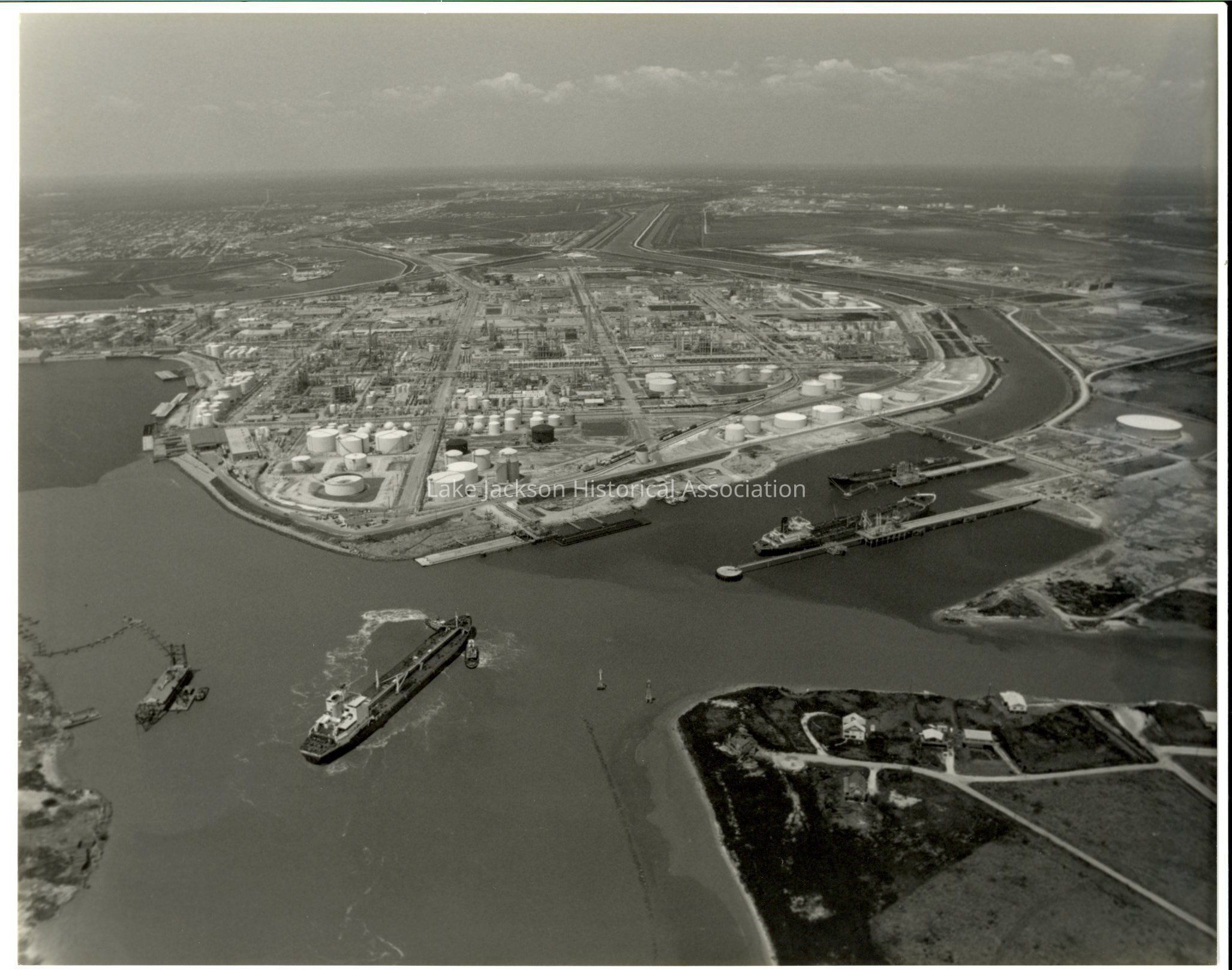 A black & white aerial photo looking from the Gulf of Mexico toward Plant A with Freeport in the left corner and Lake Jackson in the center background.Collection