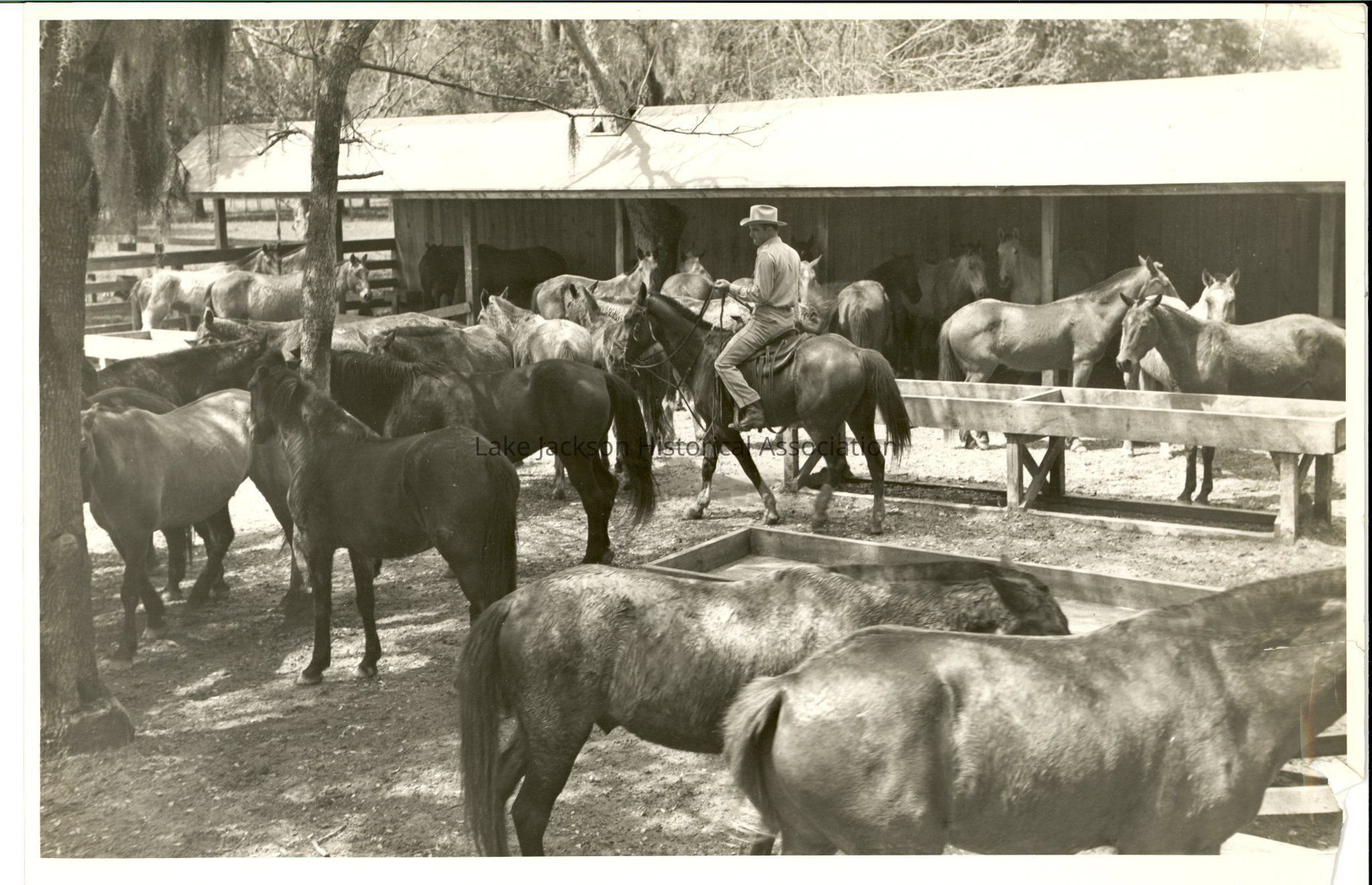 A black & white photo of a man riding a horse in front of a horse stable. There is over a dozen horses in this photo.Collection