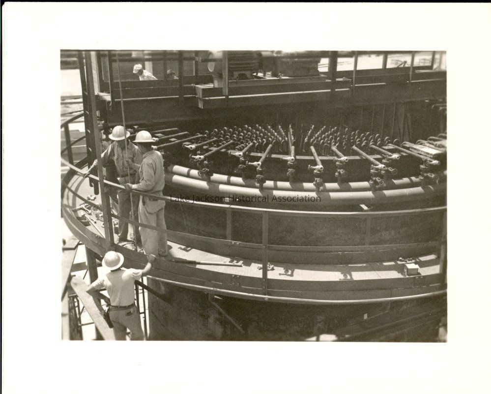 A black & white photo of three men working on construction at the Dow Plant in 1952. Written on back of the photo is "Caustic-FP-'52 Construction."Collection
