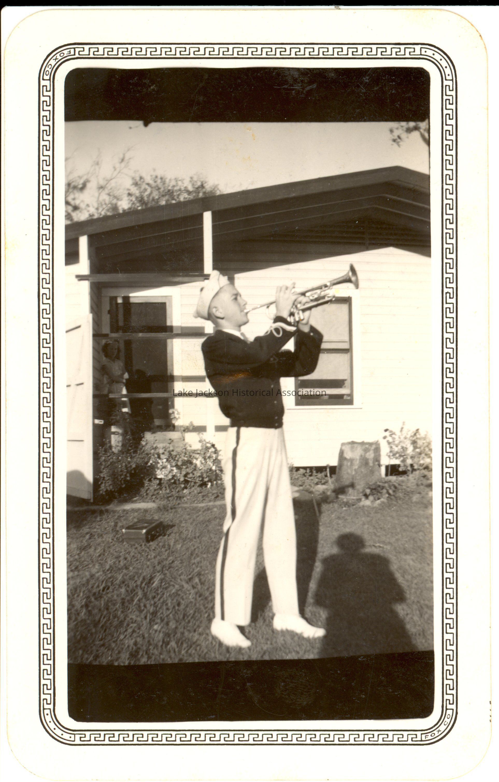 Black and white photo of a student in a band uniform, playing a trumpet in front of a wooden building.Collection