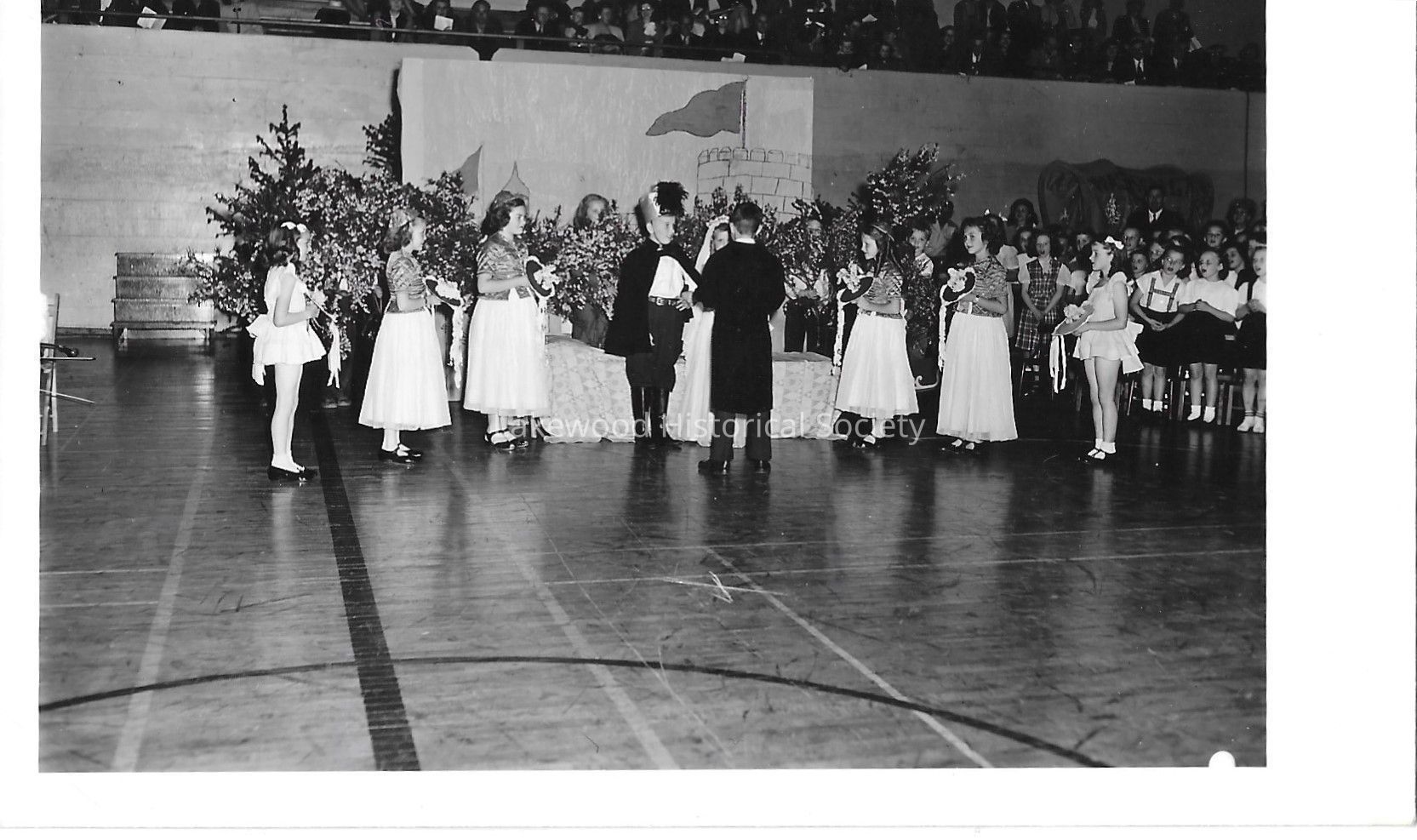 Black and white photograph of children participating in what appears to be a fake wedding. There are three girls on either side of the "couple" standing in the middle. A child stands in front of the "couple" and appears to be officiating. in the background in a castle turret with billowing flag. They are in the middle of the Clover Park gym. What appears to be a children's choir is singing on the right side. Onlookers can just be seen in the raised bleachers at the top of the photo.Photograph Details