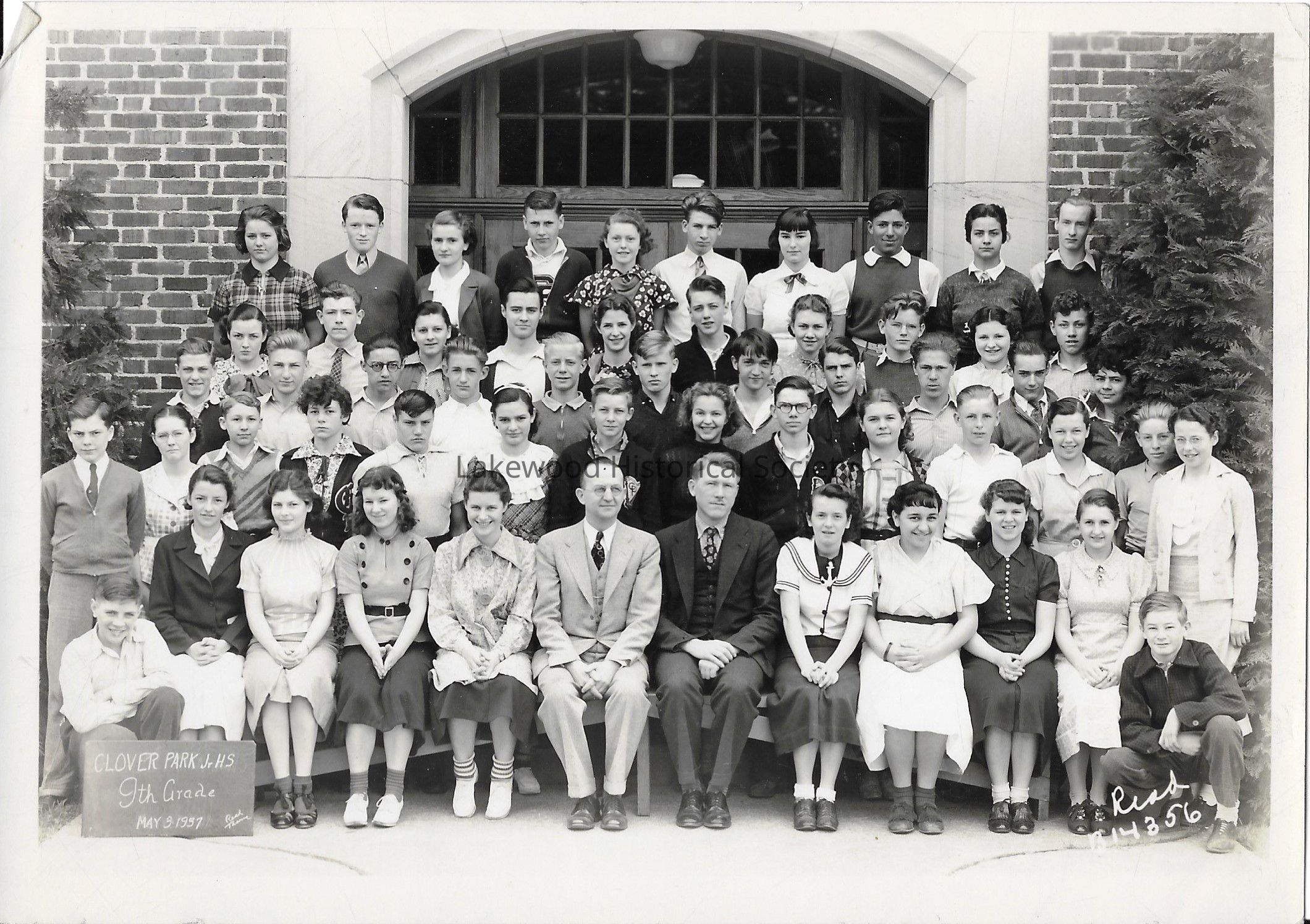 Black and white photograph of Clover Park High School 9th Grade class, taken in front of the Clover Park school building. Approximately five rows of children. There is a young boy kneeling on either side of the front row, but the one on the left is holding a sign which reads: "Clover Park Jr. H. S. / 9th Grade / May 9 1957". There is an adult woman to the far right.