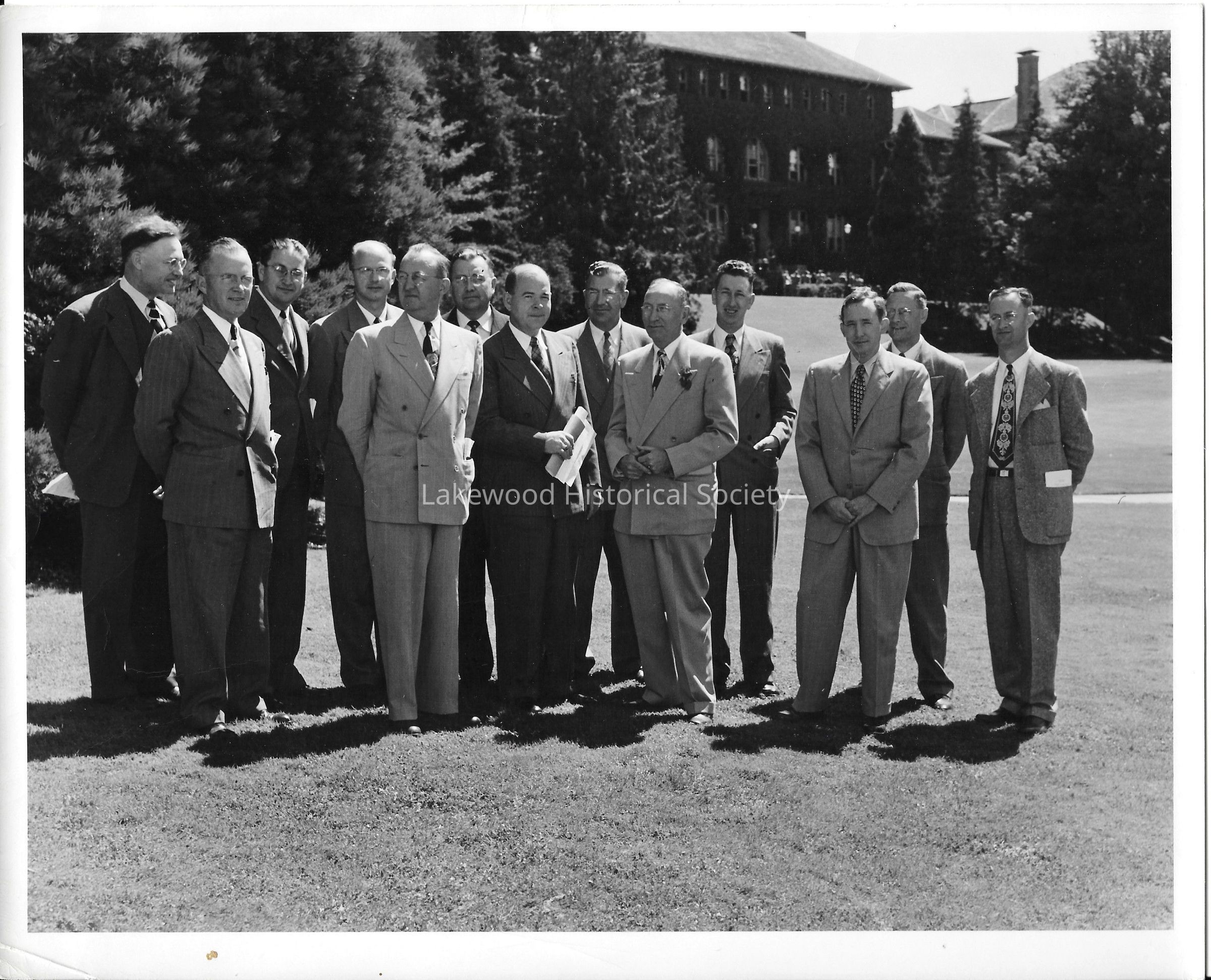 Black and white photograph of thirteen men in suits standing out on the lawn in front of a partially tree-covered building. According to notes, this is was a conference in Bellingham (possibly the city, unclear).Photograph Details