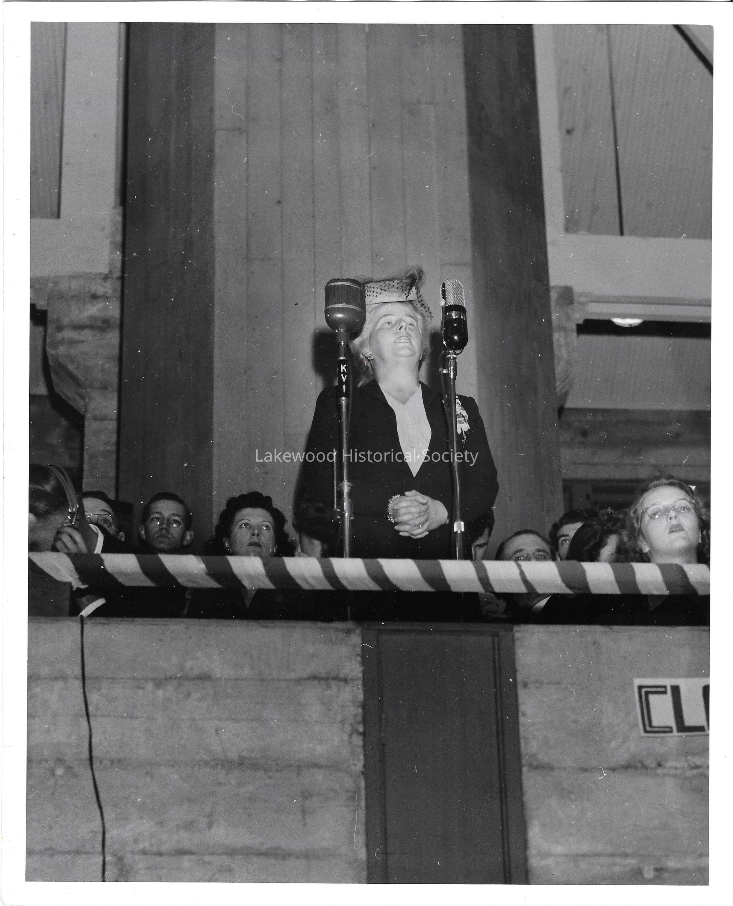 Black and white photograph of Peal A. Wanamaker, State Superintendent of Public Instruction, appearing to give a speech in front of two microphones, likely at Clover Park Jr-Sr High School. There is a small crowd seated behind her. She appears to be in a raised concrete section, likely at the Clover Park gymnasium.Photograph Details