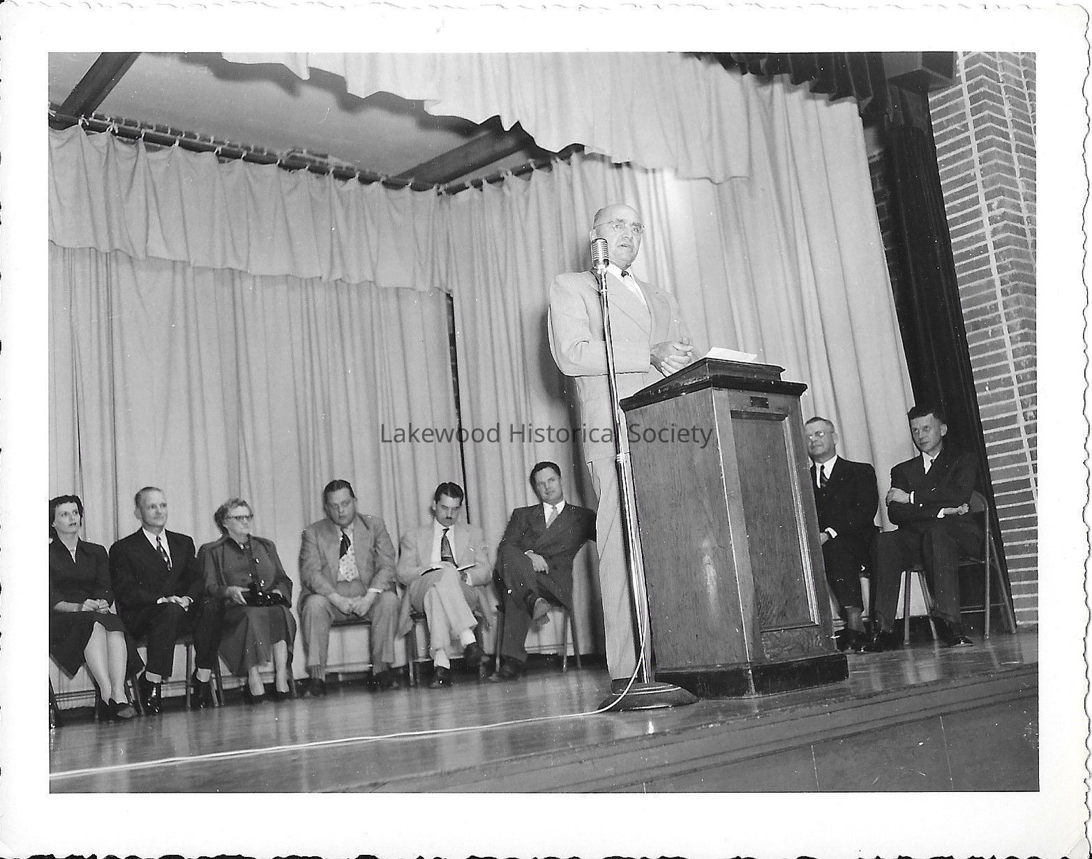 Man in light shaded suit talking to his right while at podium near standing mic while several people sit in front of curtains behind him 1950Description